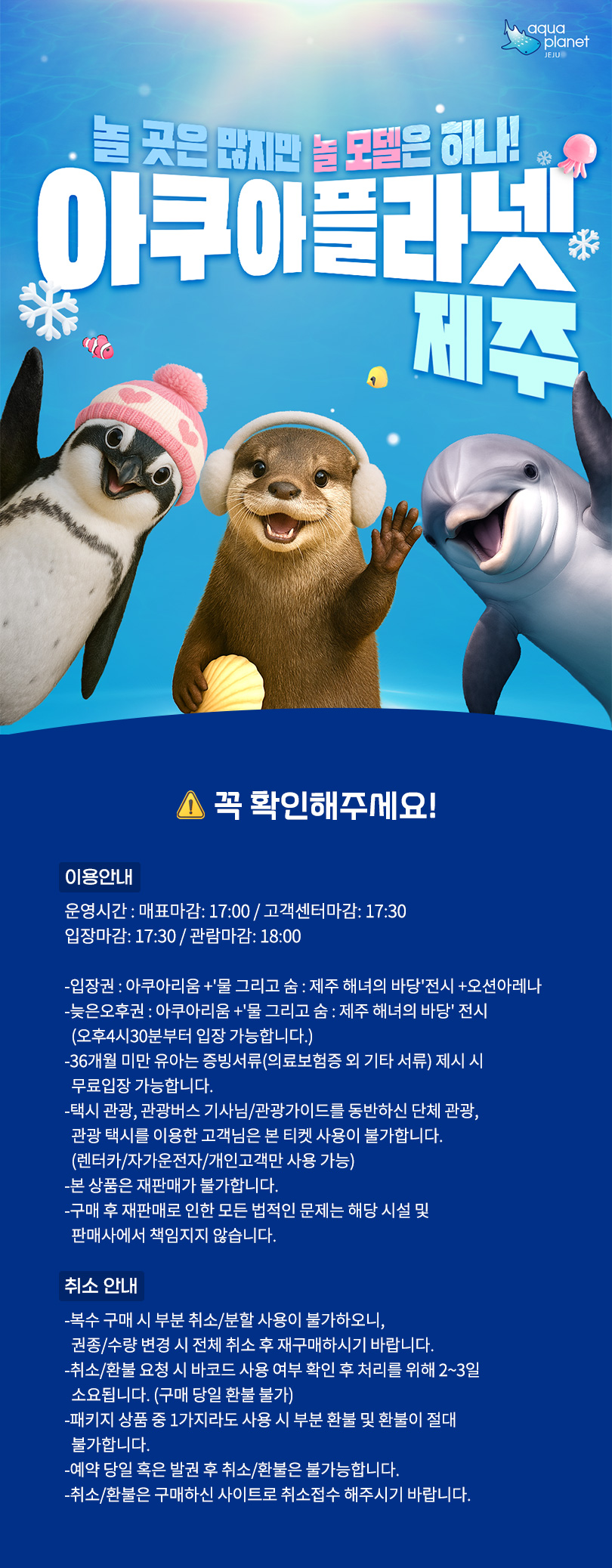 본 상품의 입장권은 아쿠아리움 + 오션아레나 + ‘물 그리고 숨 : 제주 해녀의 바당’ 전시 이용이 가능합니다.