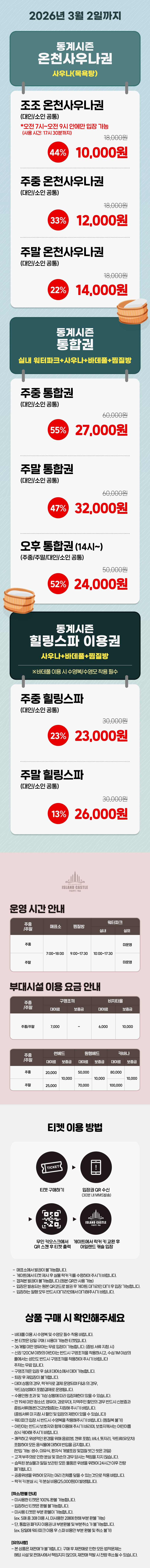 온천사우나 권종은 오전 07:00~09:00 입장 가능하며, 이용 가능 시간은 17:30까지입니다.