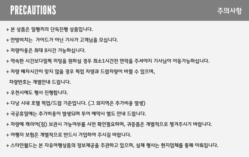 부럽트래블은 통신판매중개자이며 통신판매의 당사자가 아닙니다. 부득이한 사정에 의해 확정된 여행일정이 변경되는 경우 여행자의 사전 동의를 받습니다.