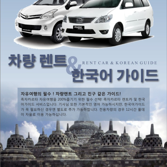 족자카르타 자유여행을 200%즐기기 위한 필수 선택! 족자카르타 렌트카 서비스입니다. 기사님 또한 기본적인 영어 가능하시지만, 한국어가이드가 꼭 필요하신 경우엔 별도로 추가 가능합니다. 전용차량의 경우 12시간 풀데이 자율로 이용 가능하십니다.