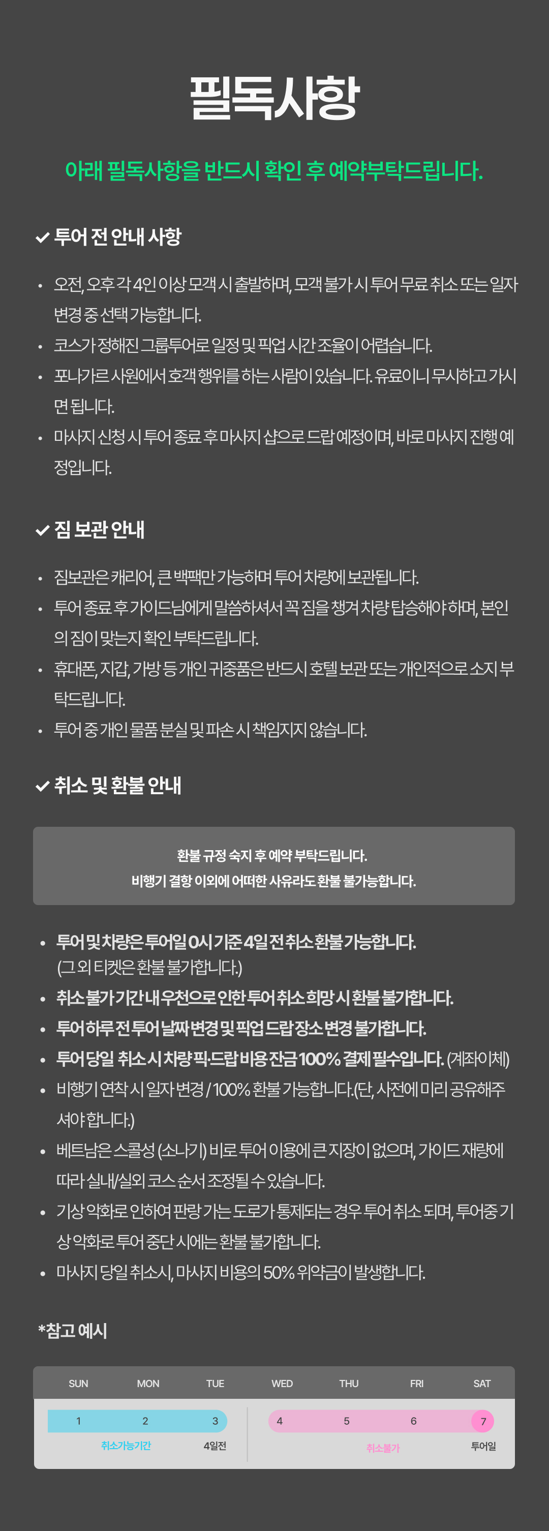 일반 투어 상품은 예약 확정까지 최대 24시간(영업일 기준) 소요될 수 있으며, 미확정 시 취소 요청이 가능합니다.
