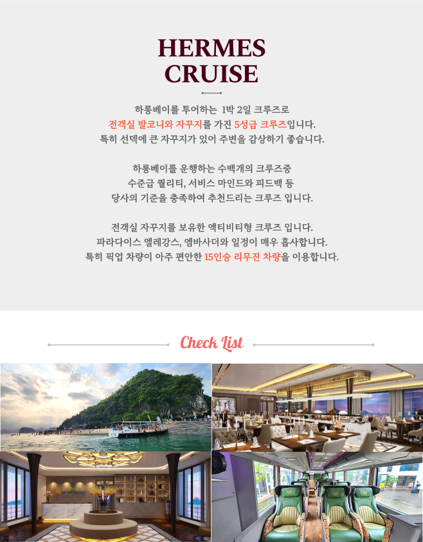 [하롱베이] 헤르메스 크루즈 하롱베이 1박2일 투어+왕복 리무진 포함 #투어형