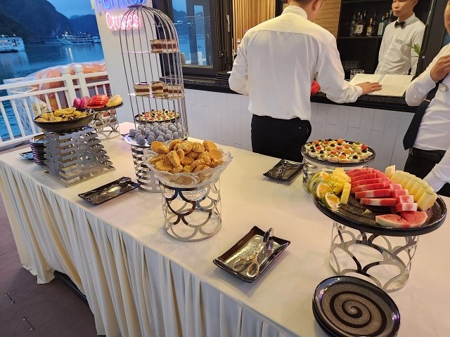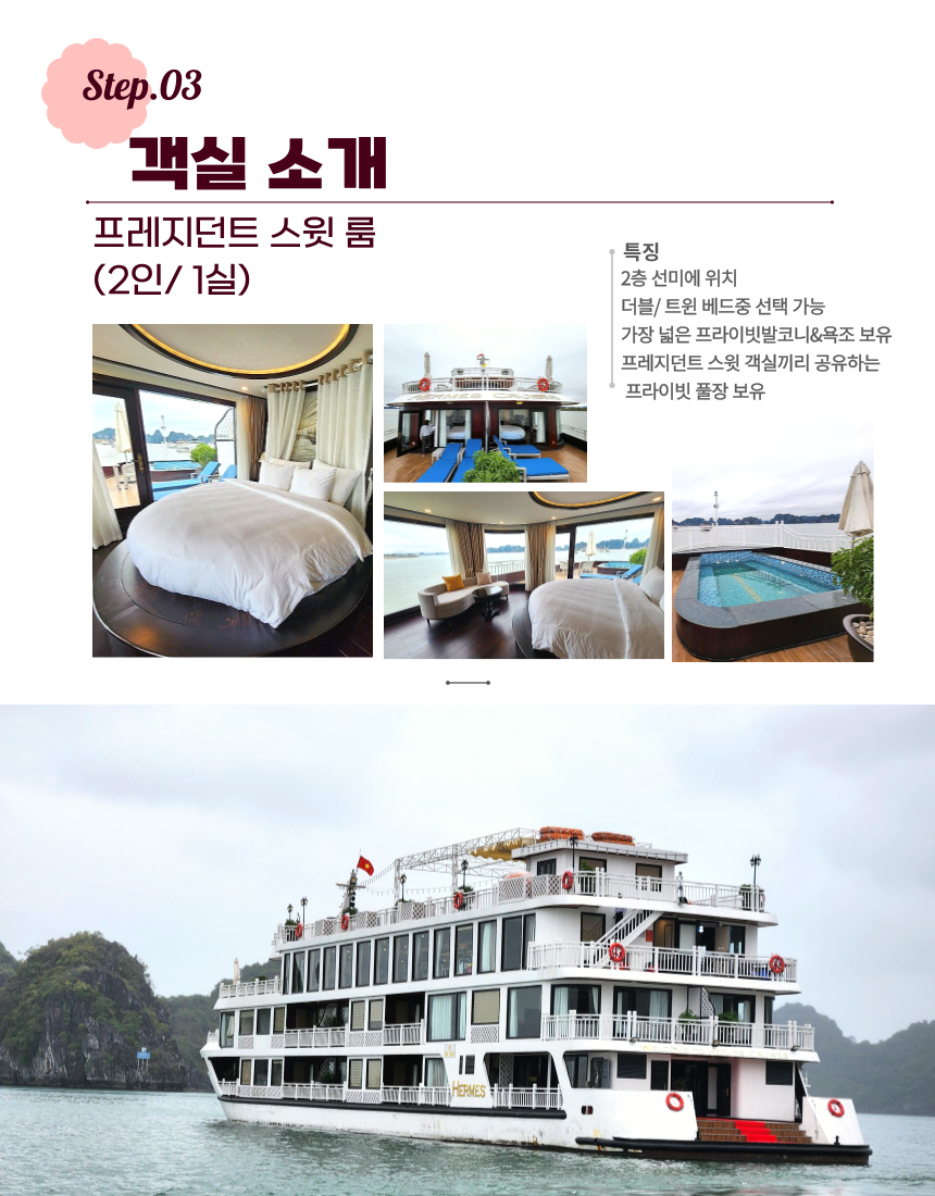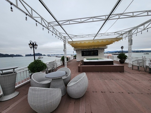 점심 식사 후 선덱 혹은 객실에서 오후 3시까지 자유시간을 가집니다. 중식 식사 후 부터 언제든지 수영장 이용이 가능합니다. 섬이나 동굴 투어 대신 수영장에서 멋진 하롱베이 풍경을 감상하며 수영을 즐기실 수 있습니다. (투어를 모두 다녀오시더라도 이용이 가능하나, 시간이 길진 않습니다)