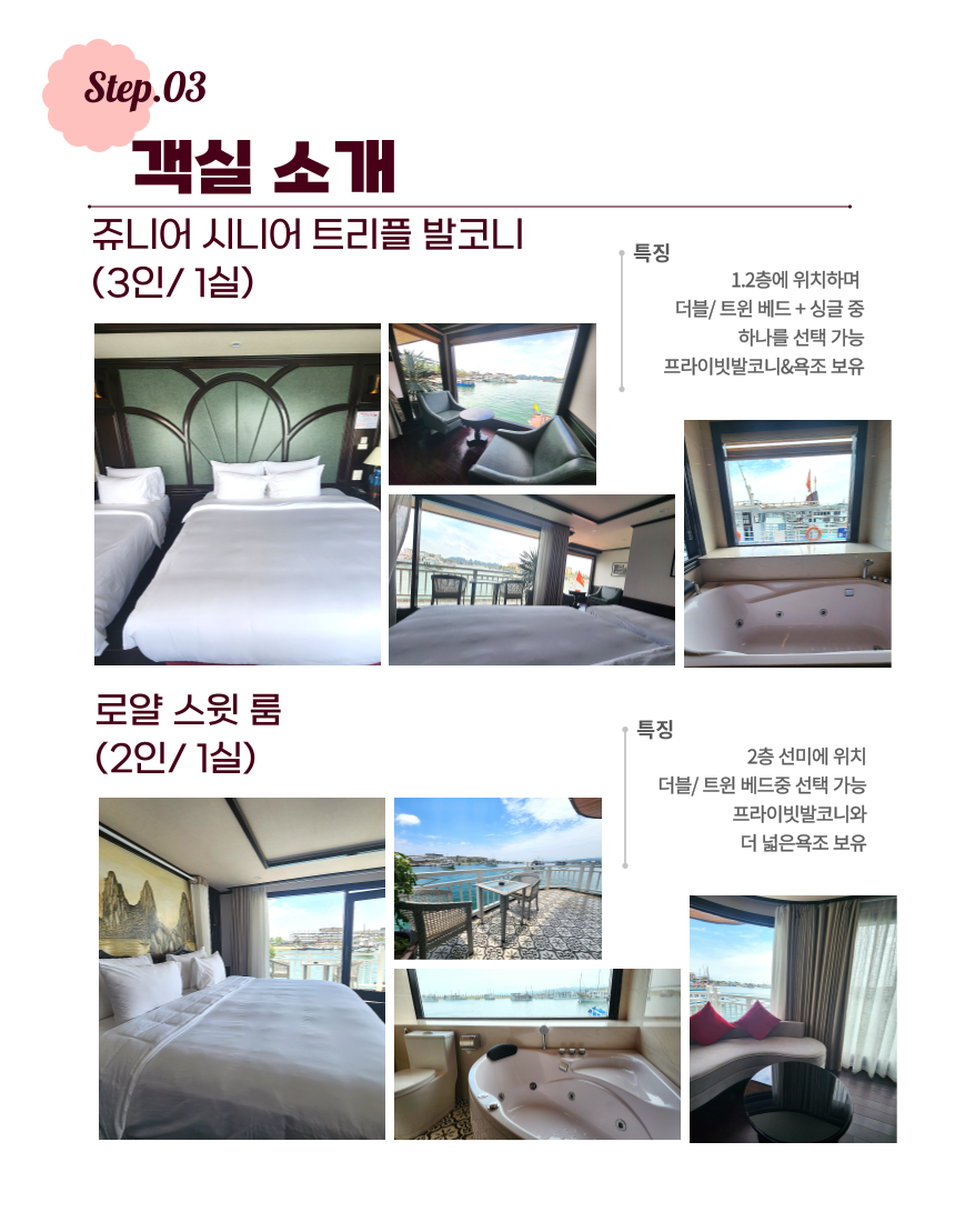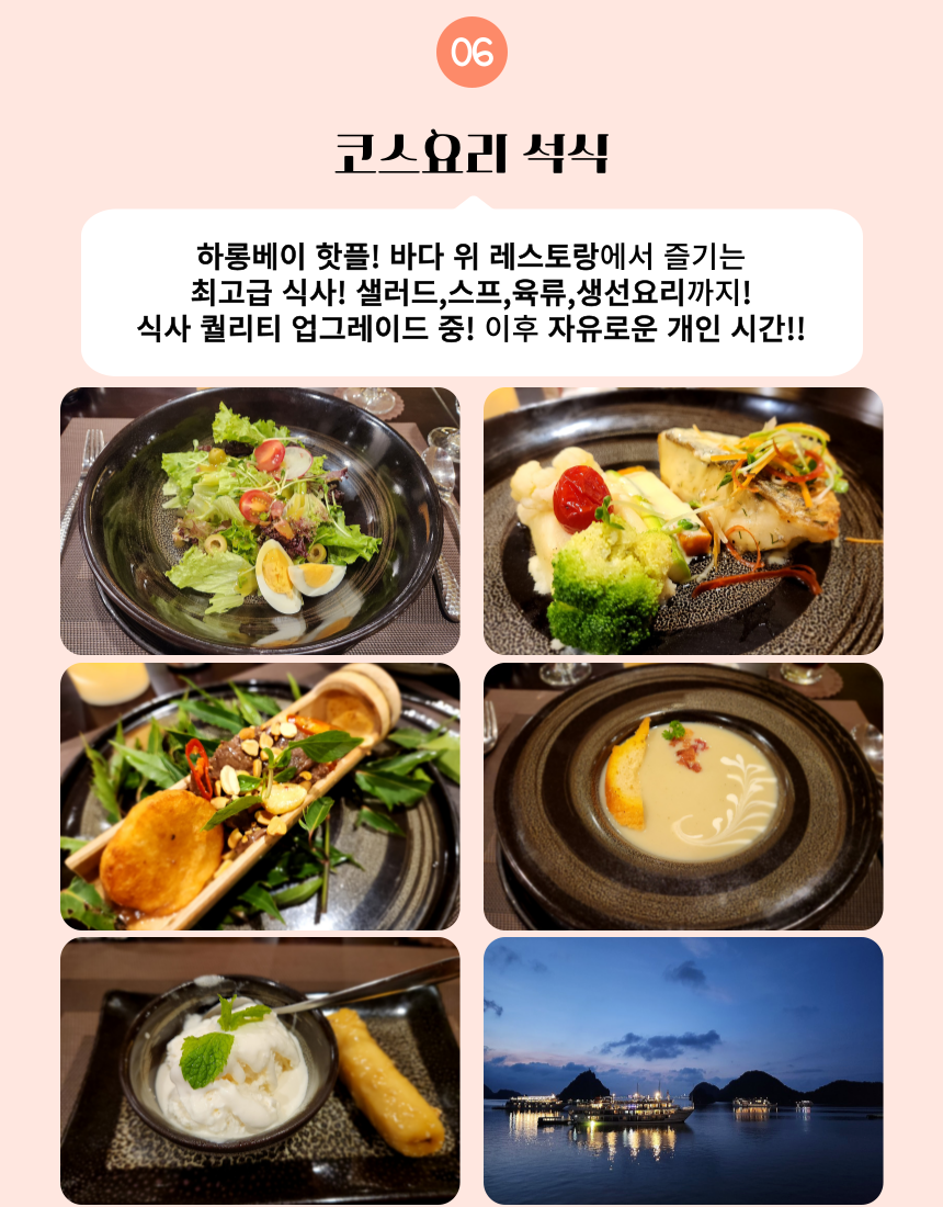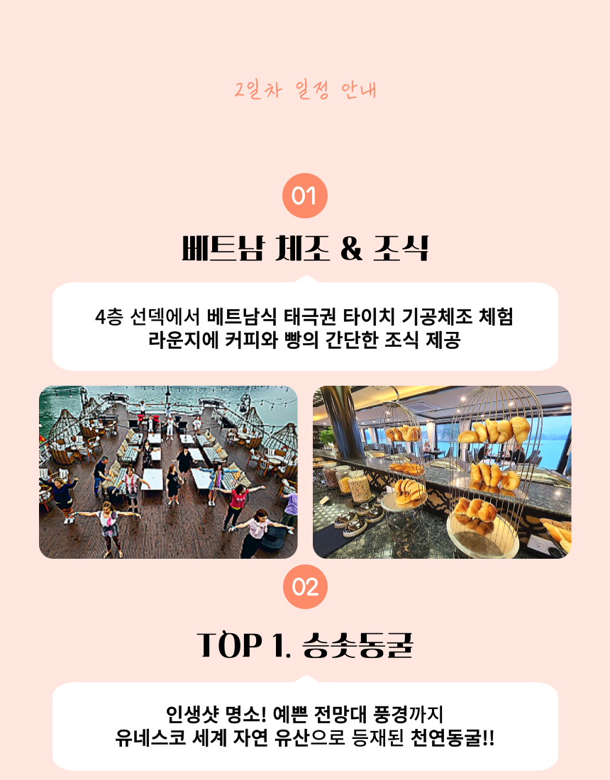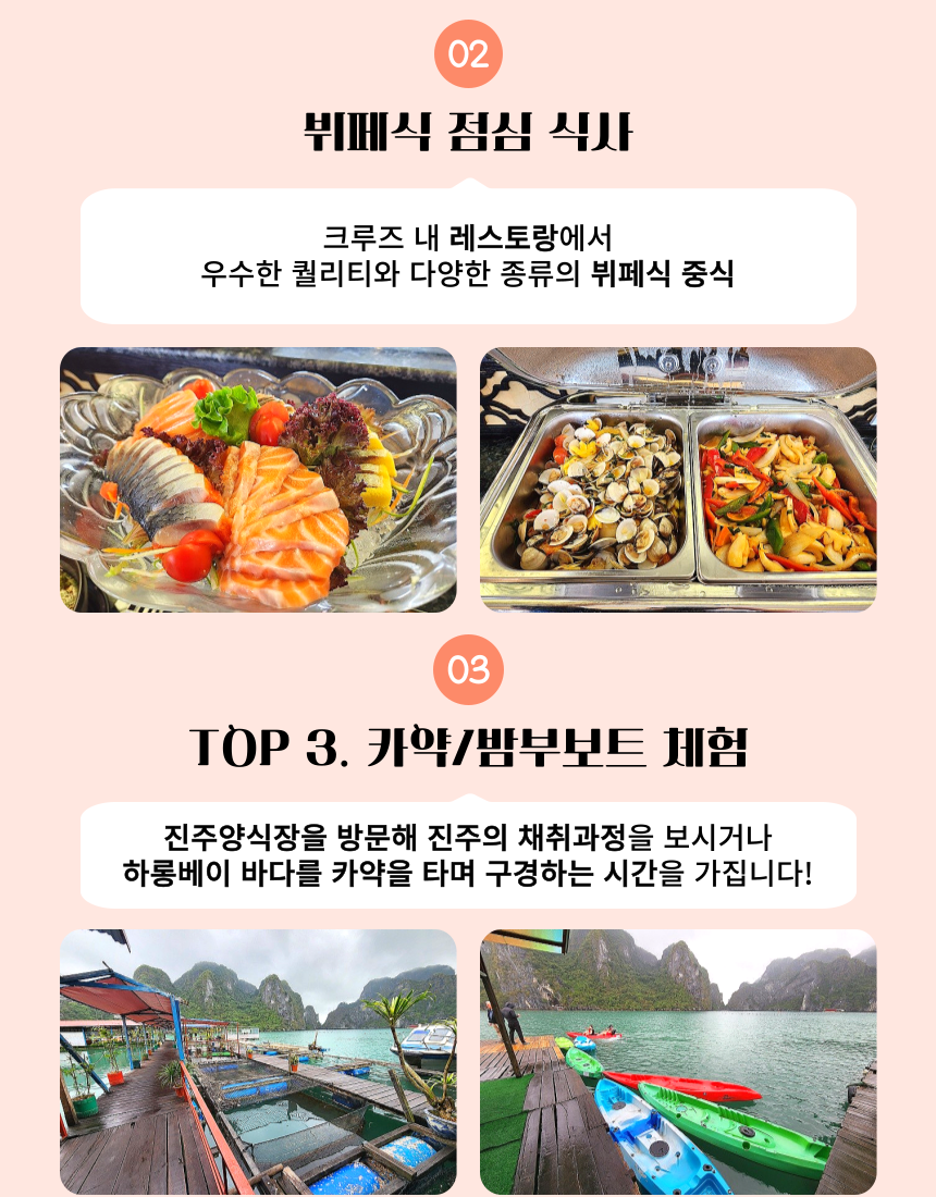 이렇게 상품에 대한 간단한 설명을 드렸구요. 저희 아이러브베트남에서는 정확한 정보 전달을 위해 당연히!!! 짧은 주기로 해당 크루즈를 직접 방문하고 있습니다 ! 주의 ! 저희처럼 상세한 설명이 없다면 직접 다녀오지 않고 판매하는 경우가 많으니 주의하세요 그럼 여행 일정을 세세히 살펴보도록 하겠습니다~ 레츠 고우!!!👉👉 * 지금부터 이하 내용들은, 당일 크루즈 현장 상황에 따라 예고 없이 변경될 수 있습니다.