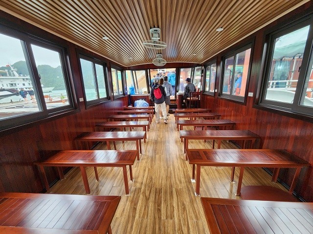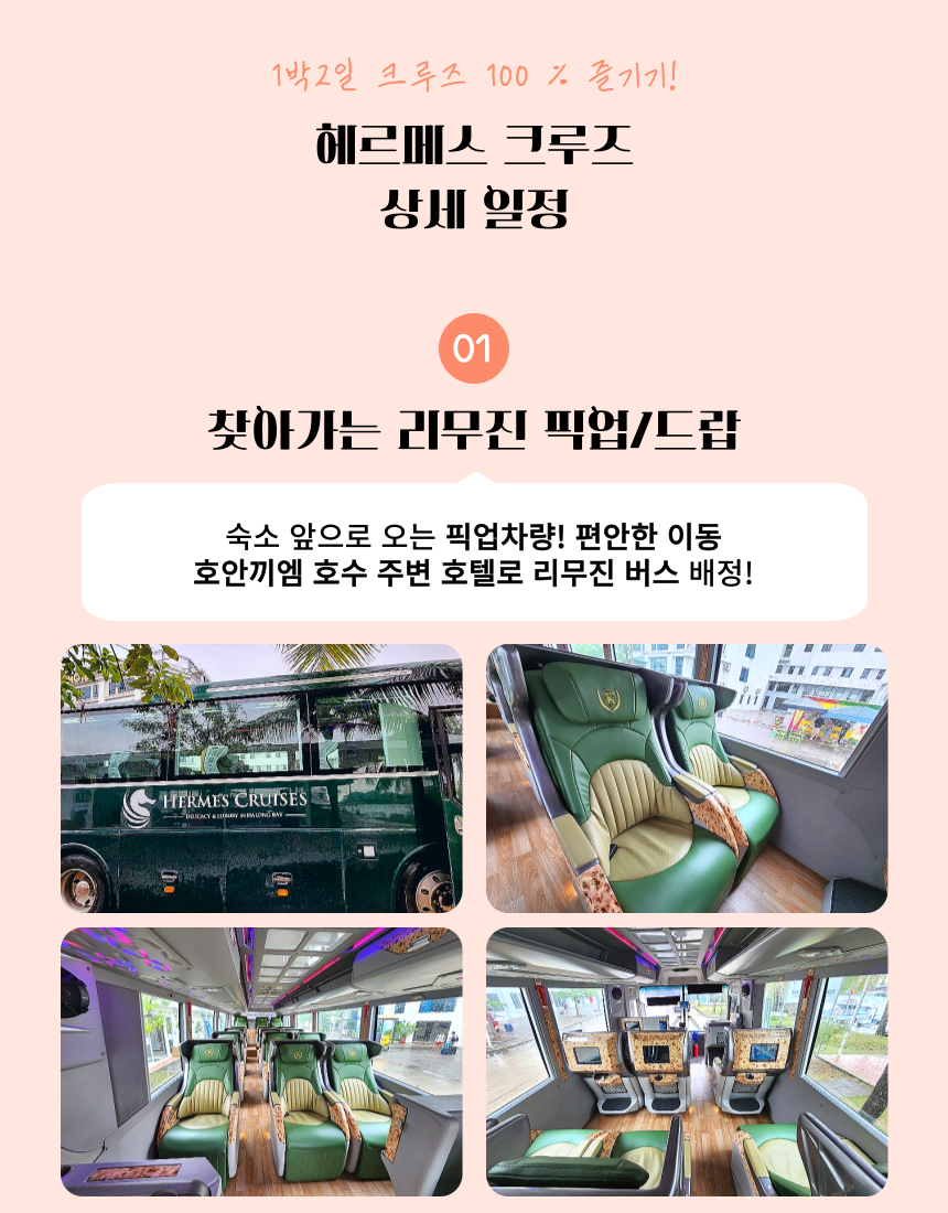 - 픽업 시간 : 오전 7시 50분 ~ 8시 20분 - 픽업 차량 : 15인승 리무진 차량 , 새고속도로 왕복 굉장히 편안한 좌석의 차량으로 고급 크루즈들이 이용하는 7,9인승 차량보다 오히려 더 편안하게 느껴졌습니다. 단, 버스 자체는 훨씬 크고 더 많은 인원이 탑승하기 때문에 픽업/드랍에 조금 더 많은 시간이 소요됩니다. - 단순 좌석의 편안함만은 하롱베이 최고라고 소개드릴수 있습니다