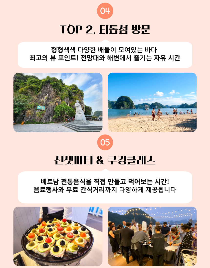 티톱섬은, 하롱베이 섬들 중에서 가장 높은 곳에 있습니다. 이곳은 최고의 뷰 포인트 입니다. 노약자는 오르기 조금 어려울 수 있습니다. 대신, 해변에서 바다수영 또는 물놀이를 즐길 수 있습니다. - 비치 체어 이용시 3만동 내외의 이용료가 있습니다. ( 개인 부담, 현장 결제 )