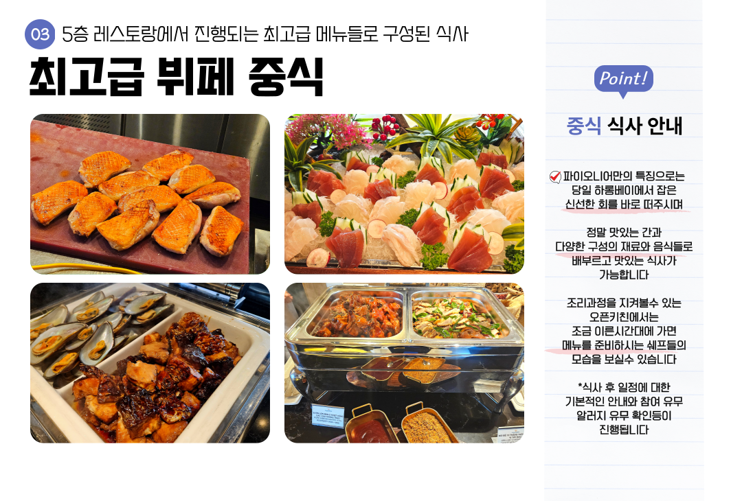 • 🍴 식사제공 : 풀보드 식사 제공 ( 총 4끼 - 중식 / 석식 / 조식 / 브런치 )