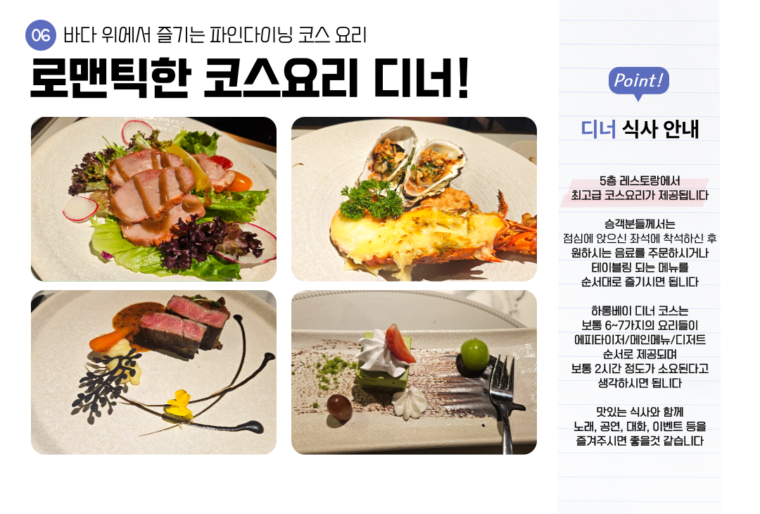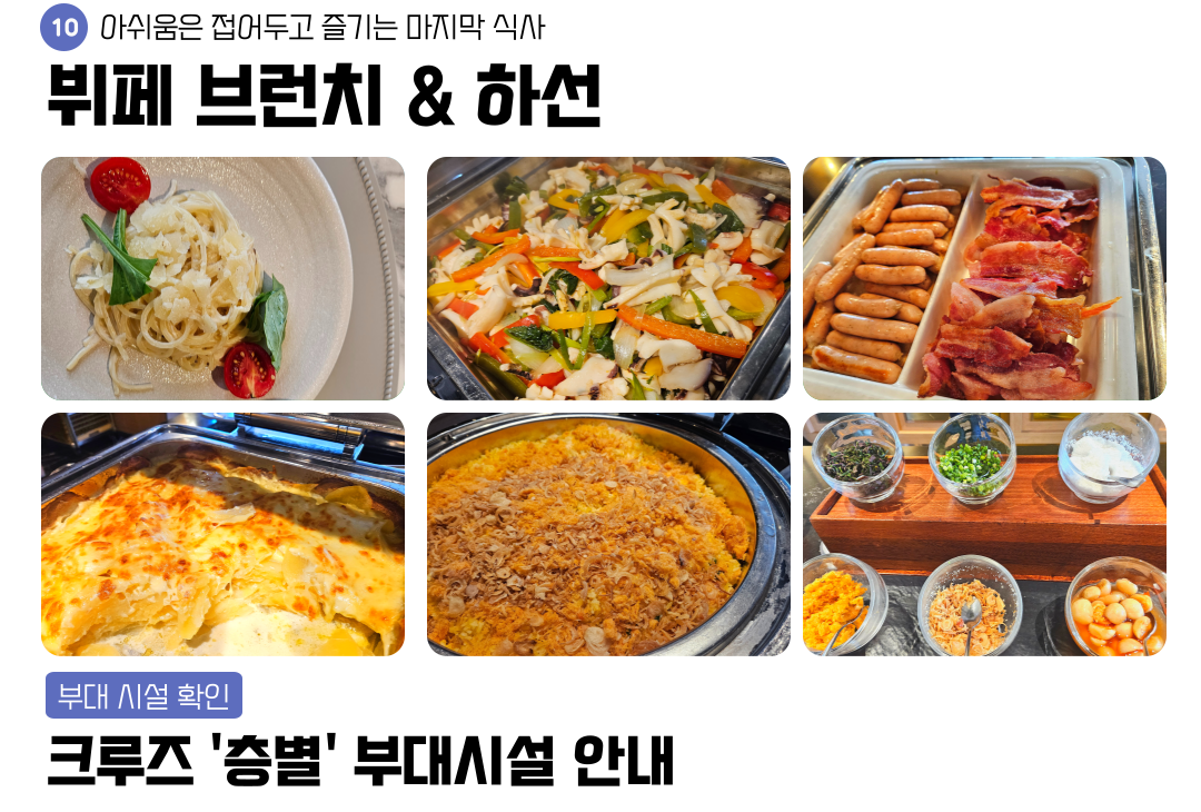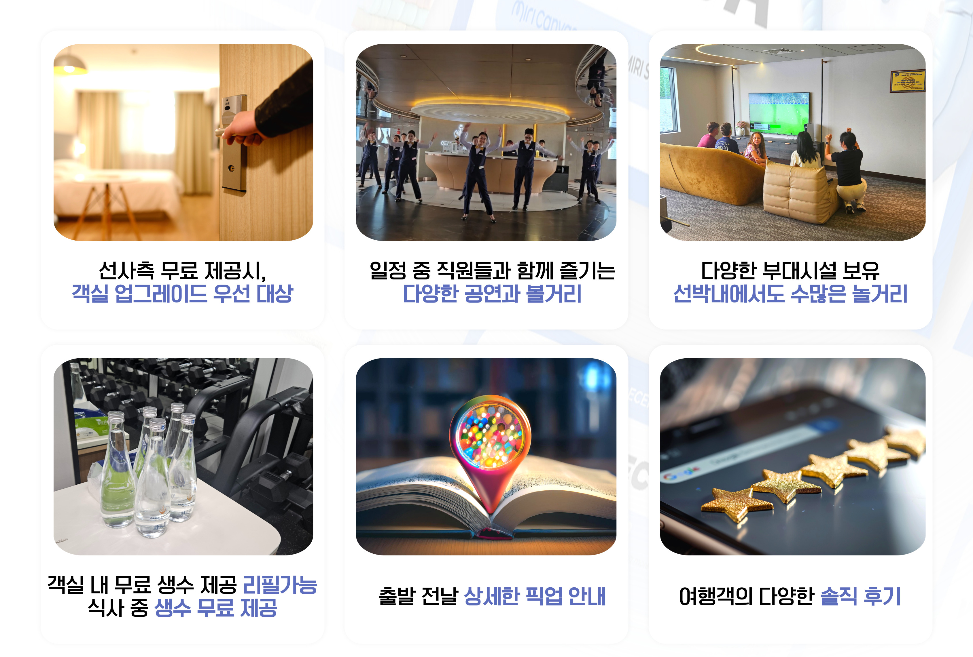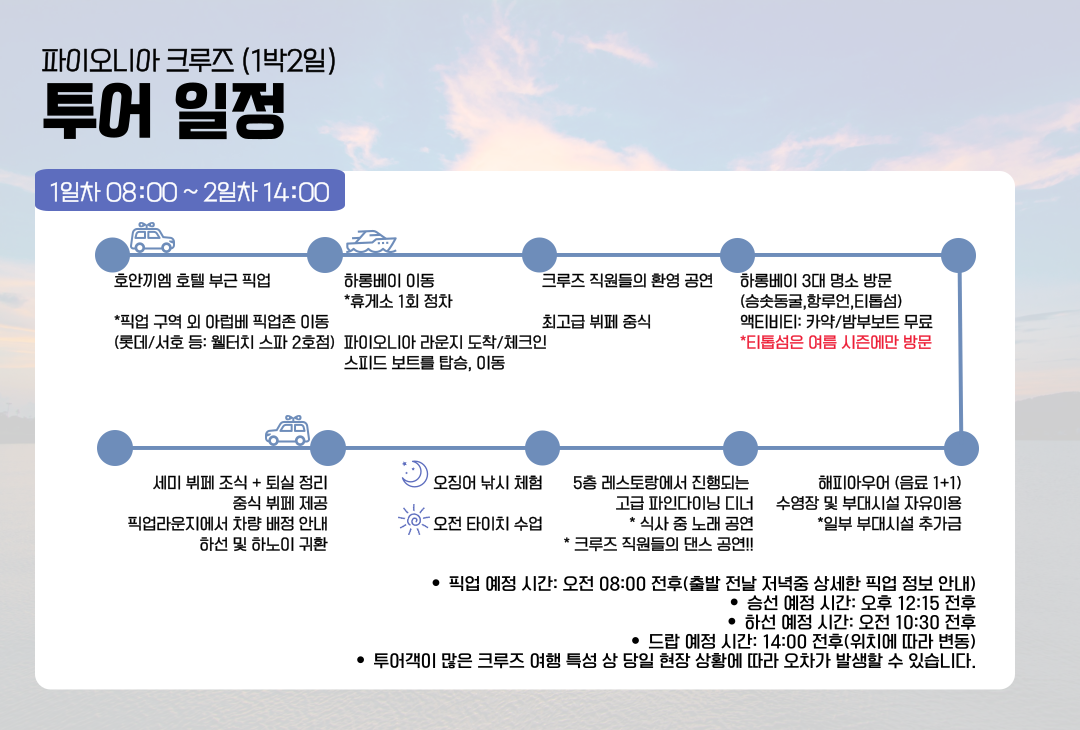 • 상세 설명의 일정으로 이루어지나 당일 크루즈 상황에 따라 소폭 변경될 수 있습니다.