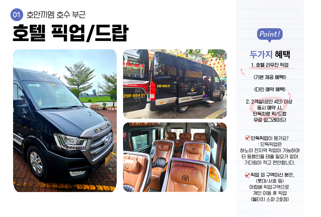 • 롯데, 인터컨, 서호, 호안끼엠 호수 부근에서 픽업 가능합니다, 단 시내에서 거리가 먼 호텔은 픽업이 불가능 해