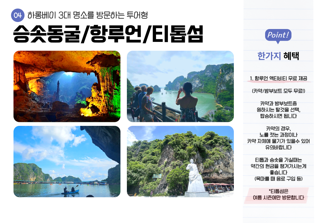 하롱베이 3대 명소인 항루언, 승솟동굴, 티톱섬(여름 시즌 한정 방문)을 방문하며