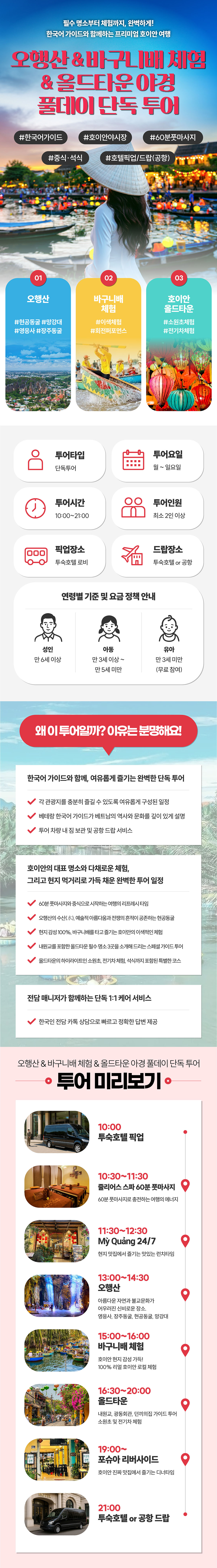 1. 투숙호텔 픽업(10:00) • 투숙호텔 로비에서 가이드분을 만납니다. • 픽업시간 10분전에 대기를 합니다. 2. 줄리어스 스파(10:30~11:30) • 60분간 진행되는 풋 마사지를 통해 편안한 시간을 보냅니다. 3. My Quang 24/7(11:30~12:30) • 메뉴 중 취향에 맞는 요리를 선택하여, 맛있는 식사를 합니다. 4. 오행산(13:00~14:30) • 오행산의 사찰과 현공동굴 등을 방문하여 가이드의 설명을 듣습니다. 5. 바구니배 체험(15:00~16:00) • 전통 바구니배에 탑승하여 현지의 생생한 문화를 체험합니다. 6. 호이안 올드타운(16:30~20:00) • 내원교를 포함한 총 3곳의 명소와 고택에 방문하여 가이드의 설명을 듣습니다. • 가이드의 안내에 따라 소원초를 띄우고 전기차 체험을 합니다. 7. 포슈아 리버사이드(19:00~) • 세트식 메뉴로 저녁식사를 합니다 8. 투숙호텔 또는 공항드랍(21:00) • 안전하게 투숙호텔 또는 공항으로 이동하여 투어를 종료합니다.