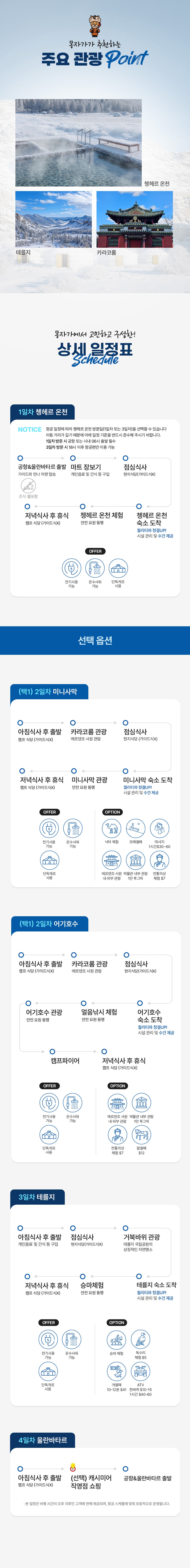 온천,은하수,모래썰매,낙타,보트탑승,승마,독수리,칭기즈칸동상,쇼핑