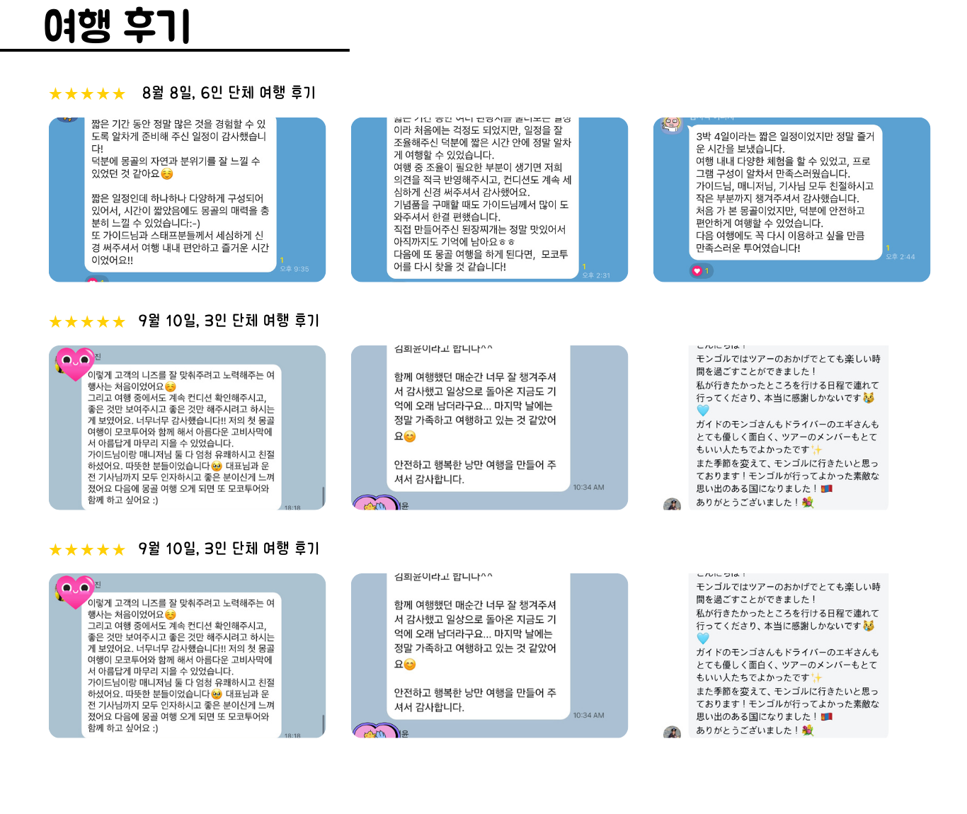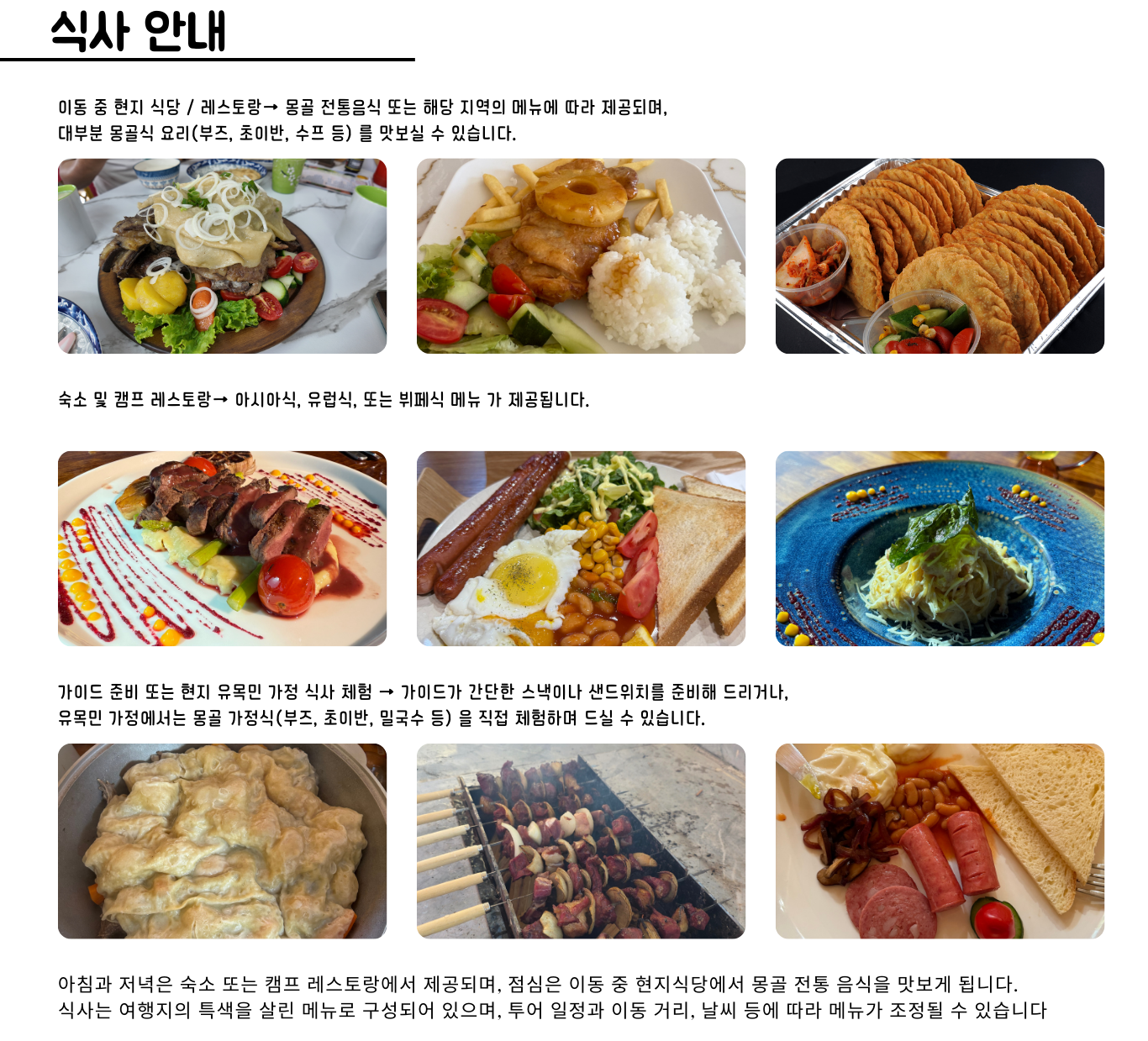 예기치 못한 차량 고장 시 여행사는 대체 차량을 즉시 지원하지만, 몽골 특성상 도착까지 시간이 소요될 수 있습니다. 이로 인한 투어 지연 또는 일정 미소화에 대한 환불은 불가합니다.