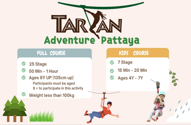 파타야는 해양스포츠뿐만 아니라 추천할 만한 투어와 관광지가 아주 많답니다. 그 중에서도 약 25,000평의 탁 트인 공원에서 즐기는 짜릿한 짚라인 체험도 할 수 있어요. 만 4세~7세 아동도 참여할 수 있는 키즈 코스(7개 플랫폼/약 20분)도 준비되어 있어 가족 단위의 여행객분들에게도 인기 만점이랍니다. 풀코스는 25개의 플랫폼으로 이루어져있고 약 50분동안 짚라인을 탈 수 있어요. 타잔 익스트림내에 짚라인 이외에도 실내 사격장이 준비되어 있으며 워크인으로 현장에서 결제 후 이용 가능합니다.