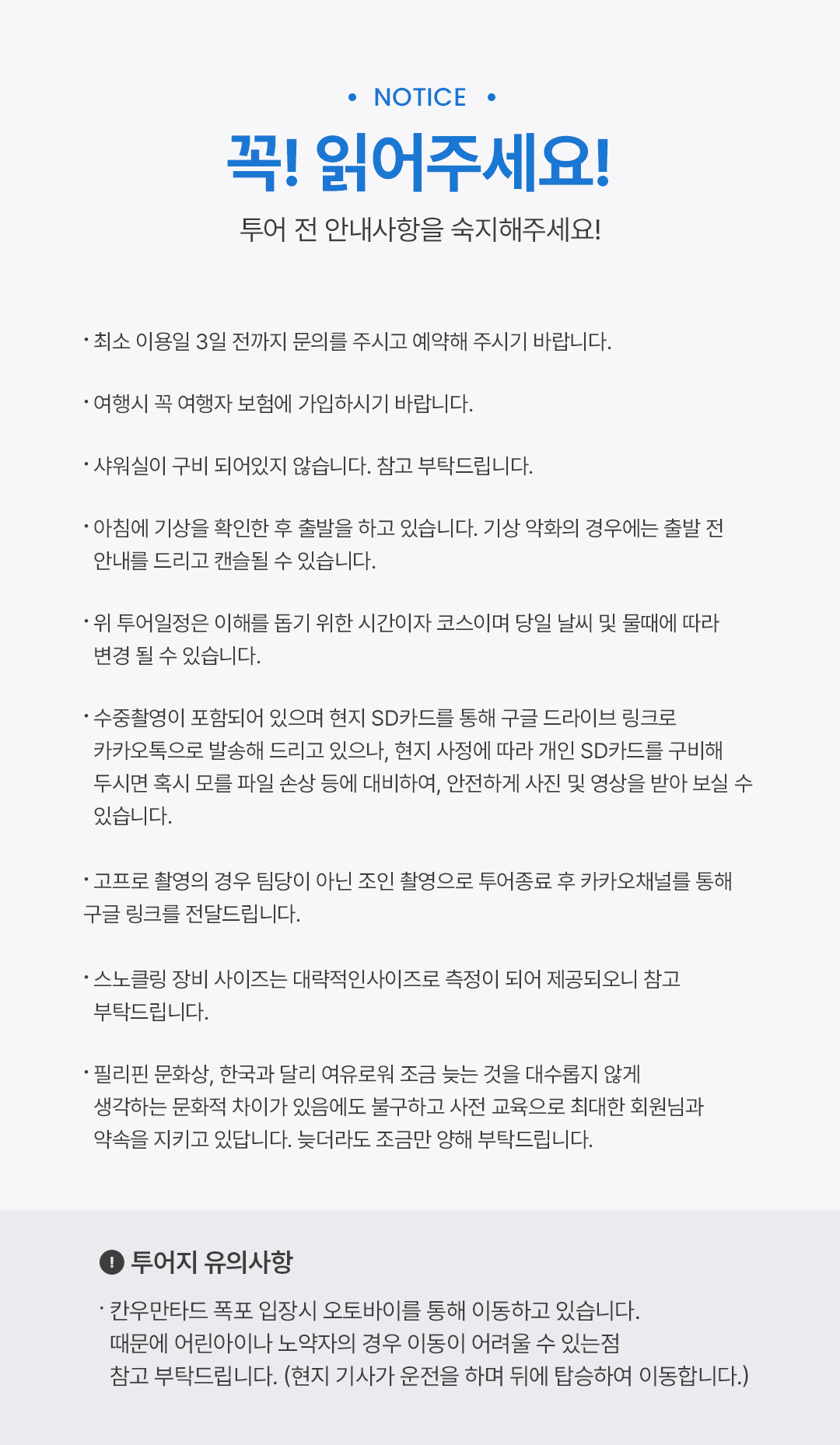 필리핀 문화 특성상 약속 시간에 다소 여유롭게 운영될 수 있으나, 가이드는 최대한 시간을 준수하도록 노력하고 있습니다. 양해 부탁드립니다.