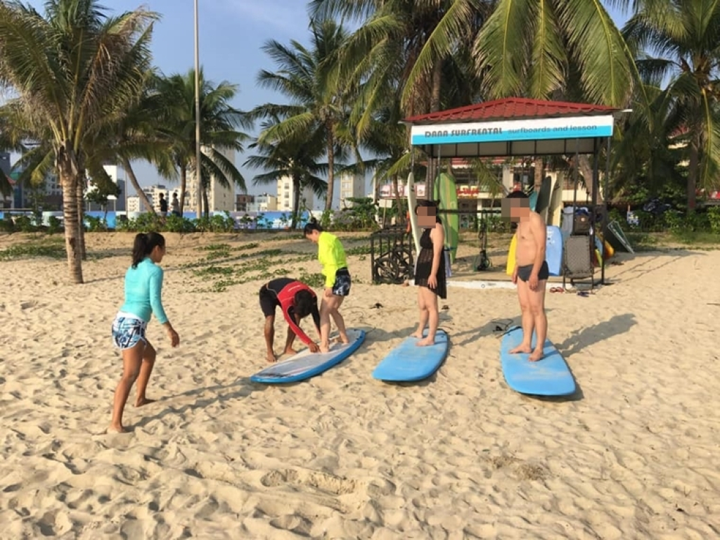 1. 픽업 또는 개별적으로 이동 서핑 레슨을 예약하실 때 투숙 하시는 호텔을 트래블포레스트에 알려주세요. 정확한 미팅 시간을 예약확정서를 통해서 안내해 드리겠습니다. 서핑래슨은 다낭의 호텔에서 여러분을 픽업하면서 부터 시작합니다. (만약 픽업서비스를 예약하시지 않으신 경우는 아래의 장소로 개별 이동 바라며, 택시 혹은 그랩 Grab 기사에게 아래 주소를 보여주시고, EBISU 식당으로 이동후 맞은편 해안 모래사장에서 DANA SURRENTAL 샵을 찾아주시면 됩니다. 268 Võ Nguyên Giáp, Bắc Mỹ Phú, Ngũ Hành Sơn, Đà Nẵng) 2. 서핑레슨 체크인 (10~15분 소요됩니다) 도착하신 곳은 다나 서프렌탈(Dana SurfRental) 입니다. 이곳에서 간단하게 몇가지 주의사항을 듣게 됩니다. 이제 부터 본격적으로 시작됩니다. 날씨에 따라서, 파도에 따라 .. 장소가 변경되기도 하지만 주로 다나 서프렌탈 앞쪽에서 진행을 할 예정입니다. 3. 미케 비치로 나갑니다(10 분정도 소요) 4. 비치에서의 실전 연습(15분 정도 소요) 드디어 비치에서 서핑보드와 함께 실전 연습에 들어갑니다. 5. 드디어 바다로 투입! 강사와 함께 바다로 보드와 함께 투입됩니다. 이렇게 바다에서 45분간의 교육이 있고, 이후에 15분간의 휴식! 6. 레슨 종료 / 호텔 드랍(선택시) 드디어 레슨은 종료되고. 드랍을 예약하신 분들은 차량을 이용해서 호텔로 돌아오면서 투어가 종료하게 됩니다.