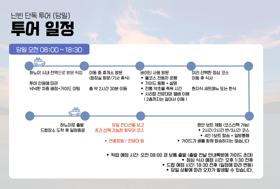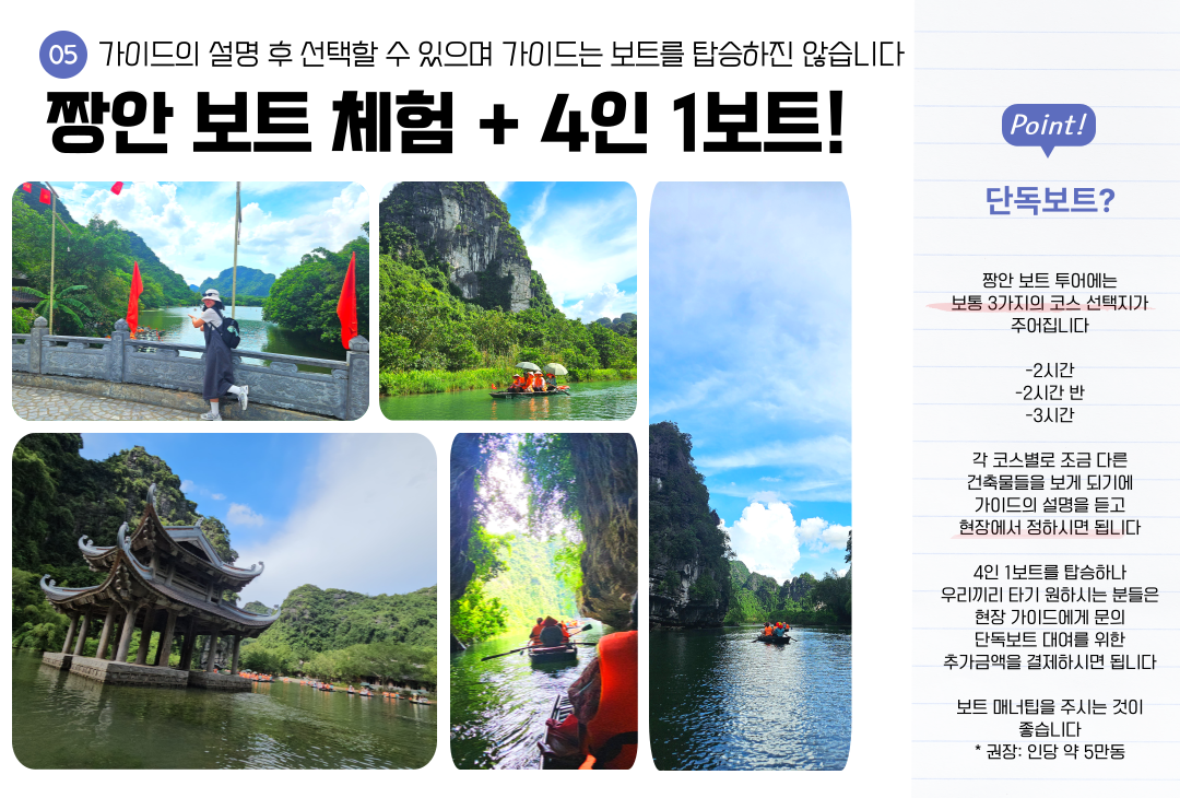• 닌빈 프라이빗 투어는 모든 분들이 좋아하는 코스이나, 가격대가 조금 있는 편입니다.