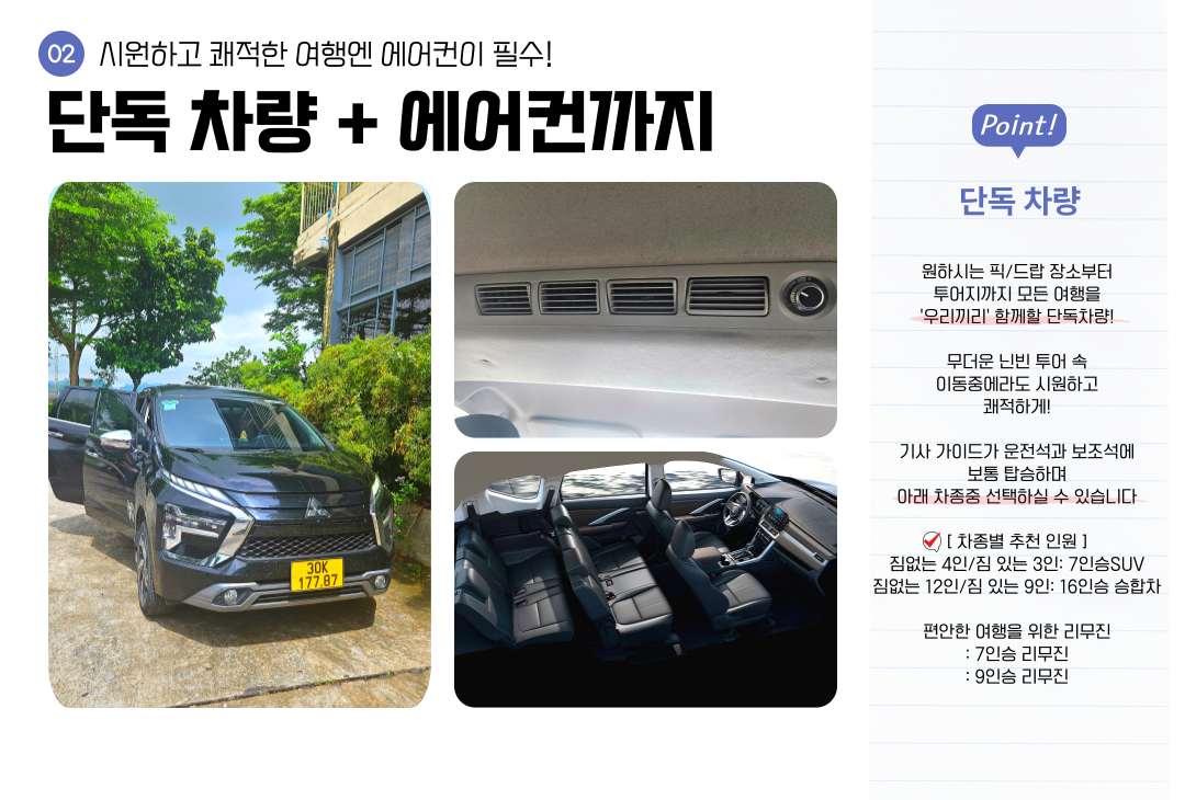나에게 맞춘 일정과 넓고 편안한 우리만의 차량으로 여행을 편안하게 즐기세요!!