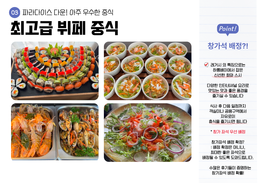 • 하선 후 추가 중식 제공(도시락 또는 뷔페, 당사를 통한 왕복 리무진 포함 예약시에만 제공)