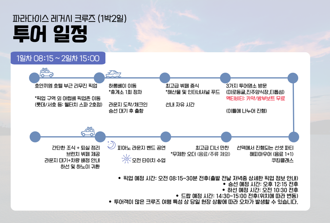 • 상세 설명의 일정으로 이루어지나 당일 크루즈 상황에 따라 소폭 변경될 수 있습니다.