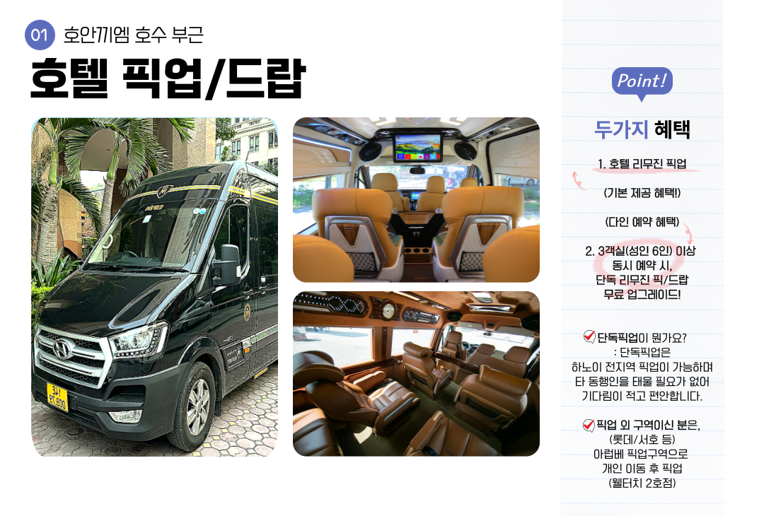 • 롯데, 인터컨, 서호, 호안끼엠 호수 부근에서 픽업 가능합니다, 단 시내에서 거리가 먼 호텔은 픽업이 불가능 해