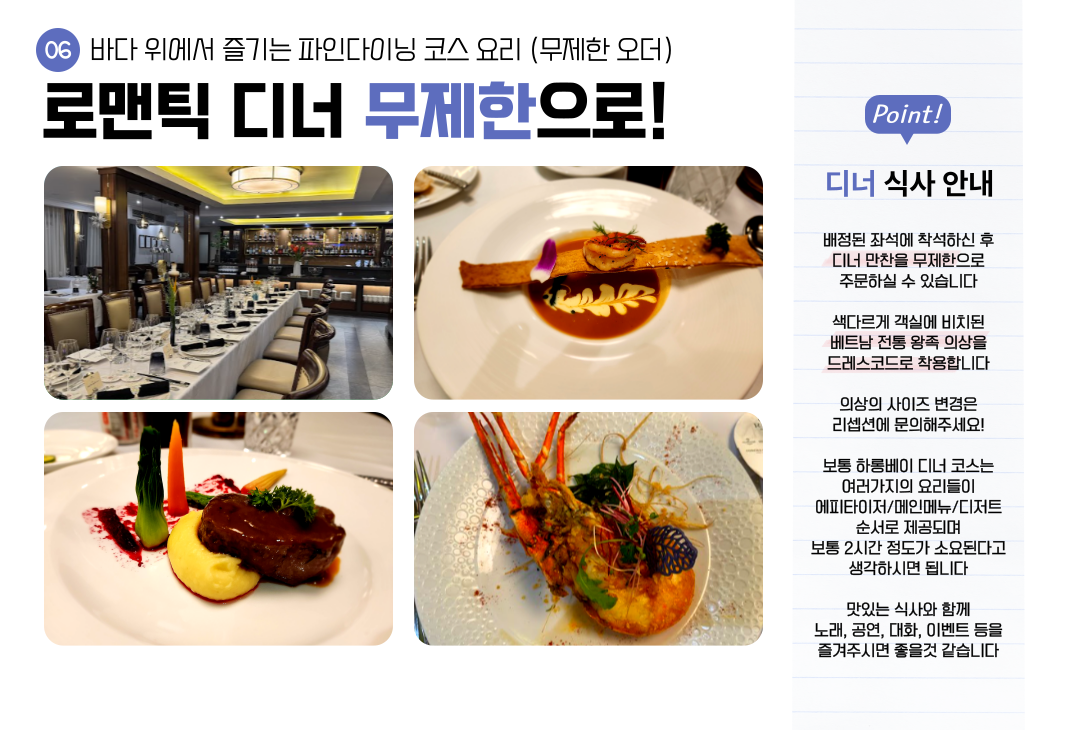 최신 1박 2일 크루즈!! 디너 파인 다이닝 코스 메뉴를 무제한으로 즐길 수 있습니다~