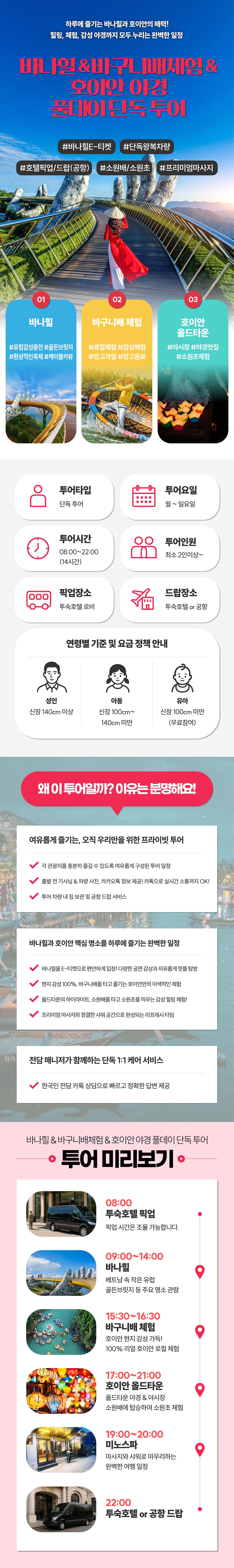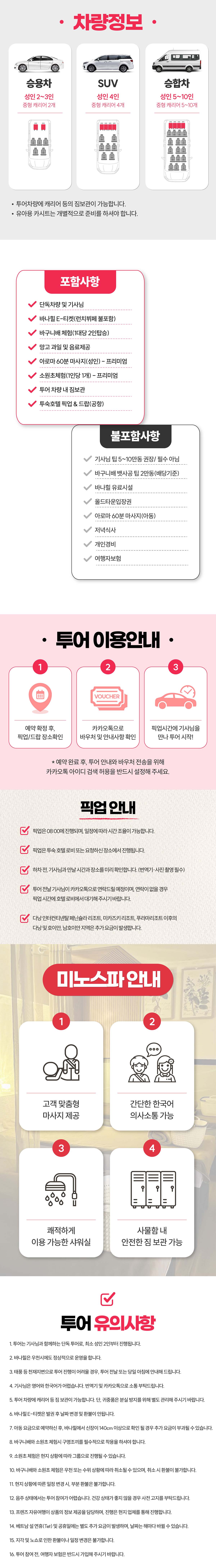 1. 단독차량 및 기사님 2. 바나힐 E-티켓(런치뷔페 불포함) 3. 바구니배 체험(1대당 2인탑승) 4. 망고과일 및 음료제공 5. 아로마 60분 마사지(성인) - 프리미엄 6. 소원초 체험(1인당 1개) - 프리미엄 7. 투어 차량 내 짐보관 8. 투숙호텔 픽업 및 드랍(공항)