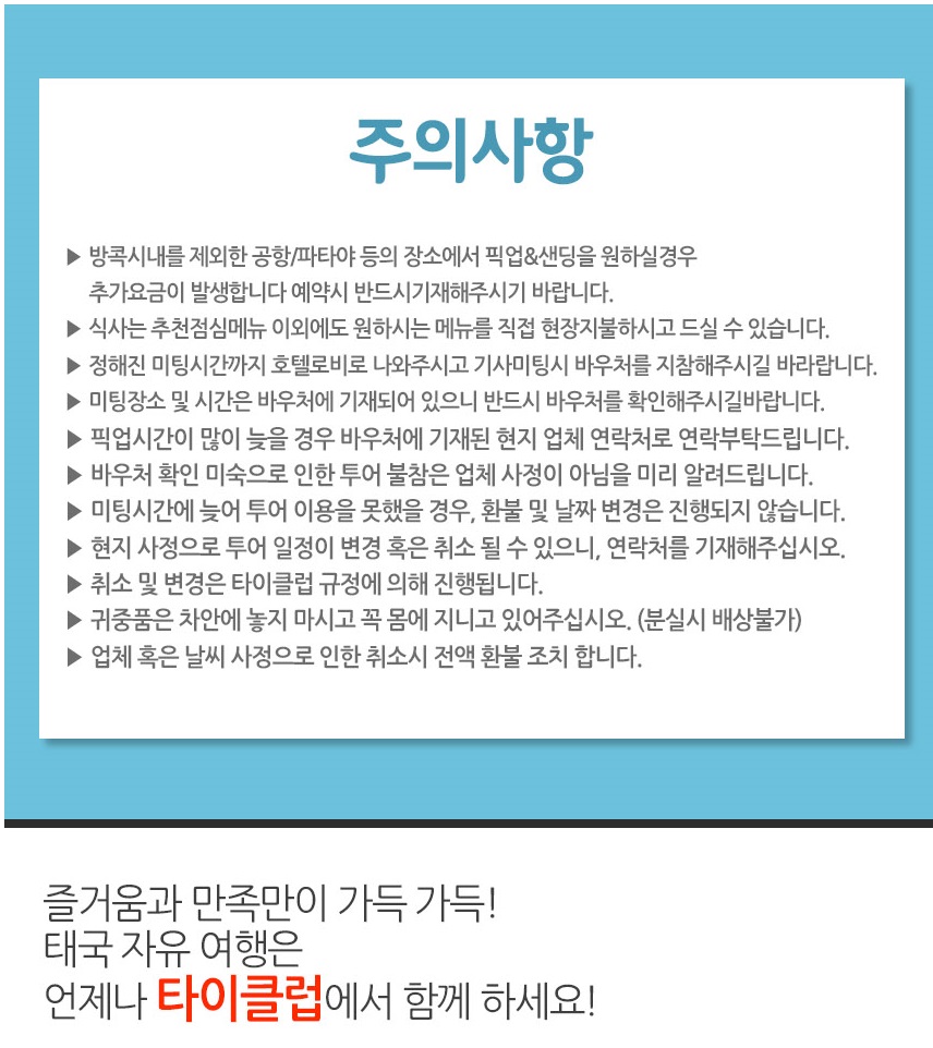 안녕하세요. 합리적인 가격, 태국 현지 여행사 "타이클럽"입니다.타이클럽은 태국 방콕에 위치하고있으며 태국 전문 여행사입니다.항상 고객님의 입장에서 생각하며, 최선을 다해 만족하는 서비스로 보답드리겠습니다.감사합니다. 파트너 상품보기