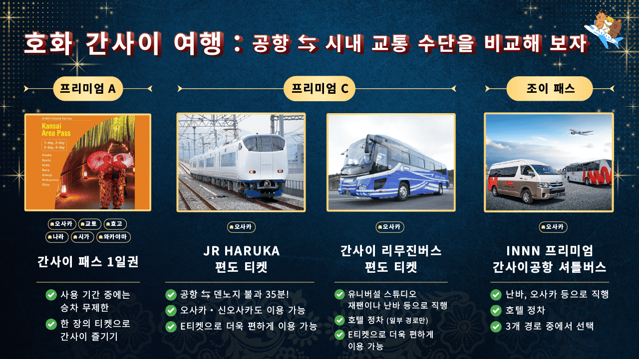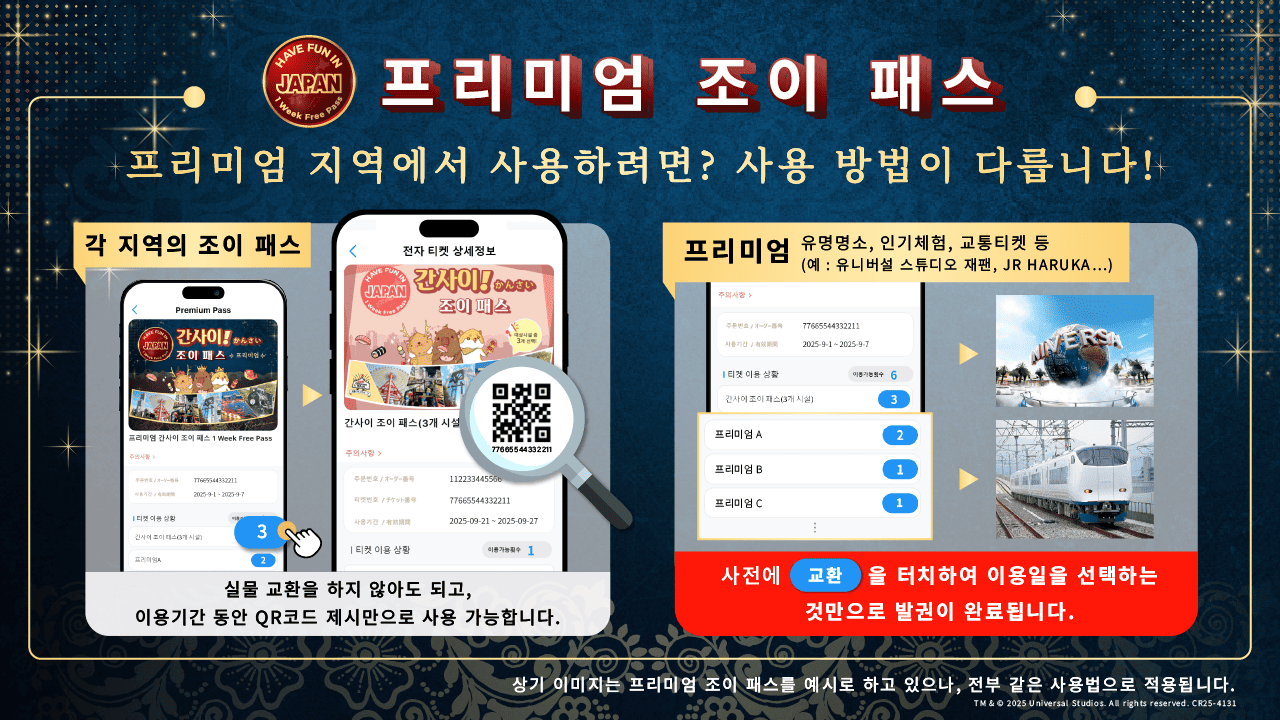 닫기프리미엄 간사이 조이 패스는 기존 ‘간사이 조이 패스(3곳 선택)’에 더해 프리미엄 A 라인업에서 2가지, 프리미엄 B의 간사이공항 리무진버스 편도 1회를 추가로 이용할 수 있는 모바일 E티켓 패스입니다. Travel Contents 앱에 티켓을 연동·유효화하면 연속 7일 동안 USJ/EXPO/JR 패스/교토 SKY HOP 버스 등 인기 시설·교통을 자유롭게 조합해 이용할 수 있어, 간사이 지역 일주 일정에 최적화된 고가성비 올인원 패스입니다.