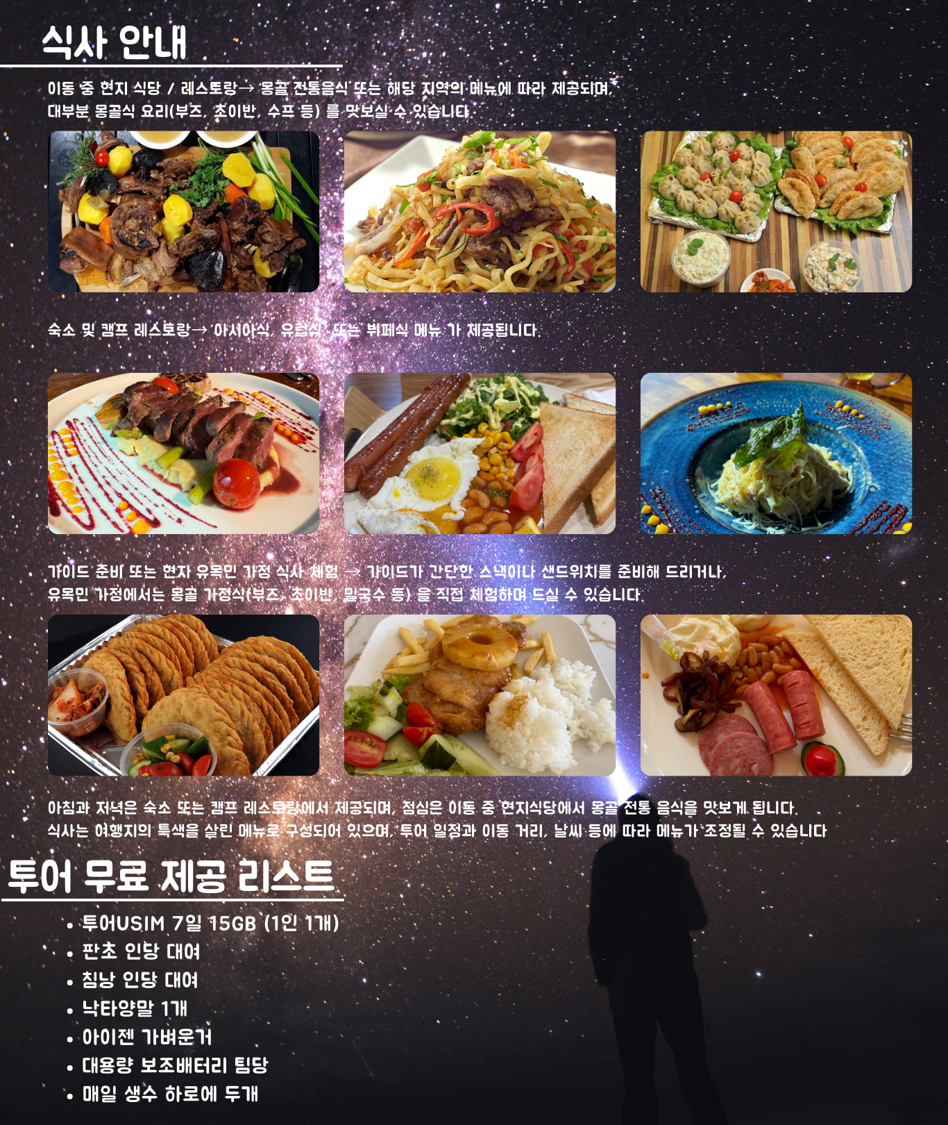 예기치 못한 차량 고장 시 여행사는 대체 차량을 즉시 지원하지만, 몽골 특성상 도착까지 시간이 소요될 수 있습니다. 이로 인한 투어 지연 또는 일정 미소화에 대한 환불은 불가합니다.