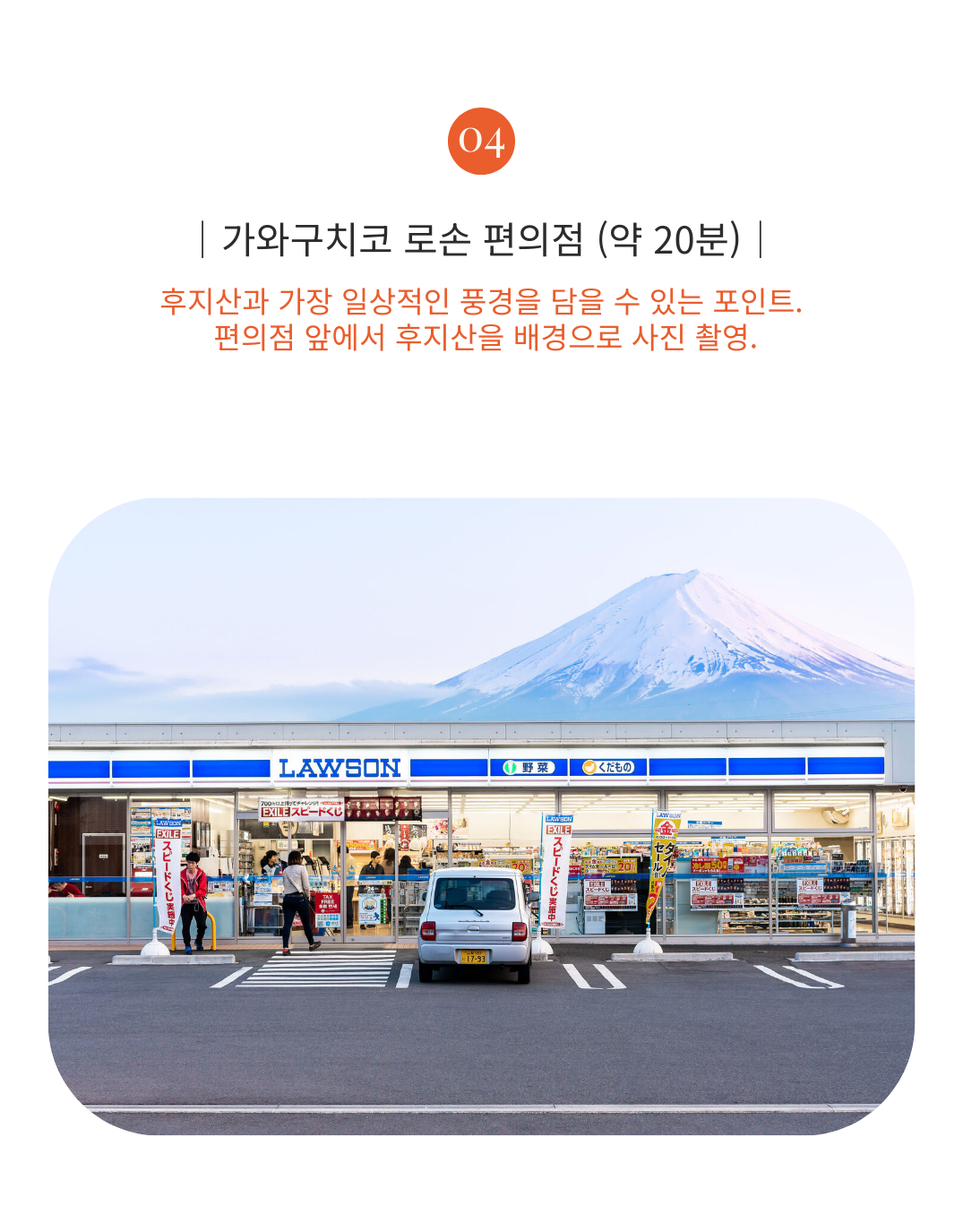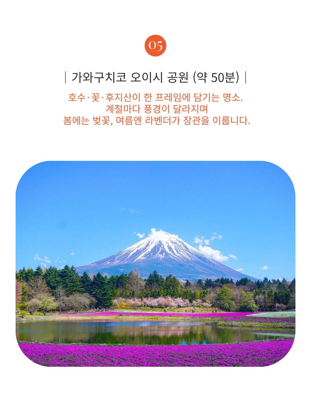 카나자와 가이드님의 인솔로 아라쿠라야마 센겐 공원, 히카와 시계거리, 오시노 핫카이, 가와구치코 로손 편의점, 가와구치코 오이시 공원까지 후지산 주변의 대표 명소들을 알차게 다녀올 수 있었어요 🤎