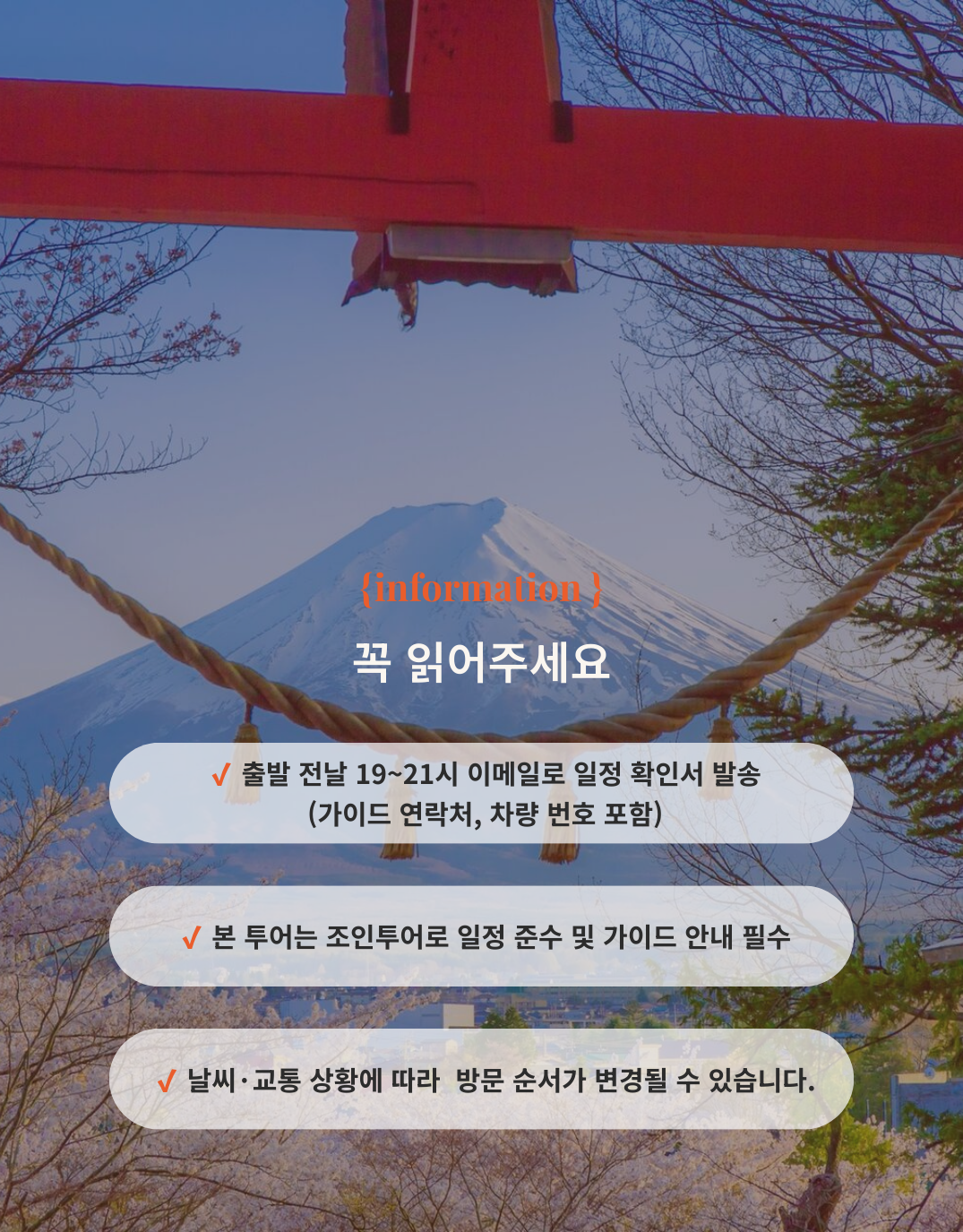 • 관광객들이 후지산을 최대한 볼 수 있도록 저희 가이드가 후지산의 가시성과 교통체증에 따라 관람 순서를 변경할 예정이며.
