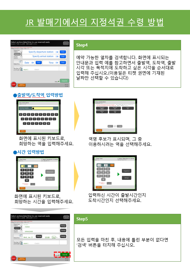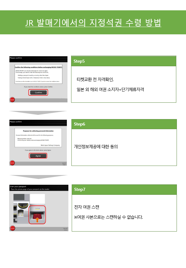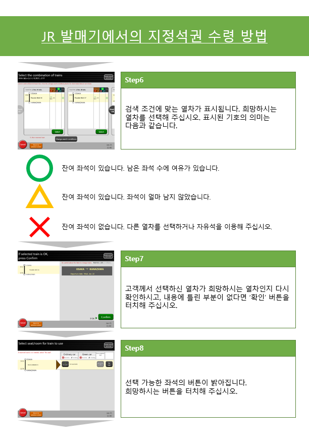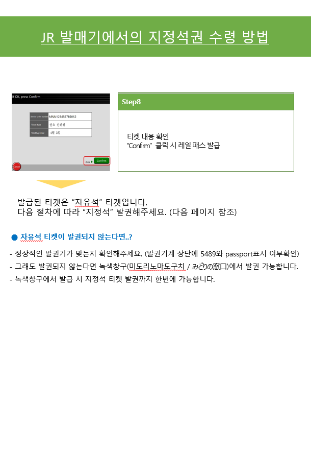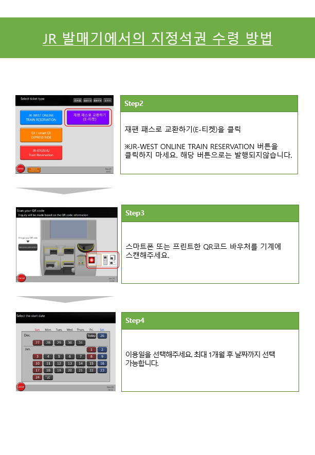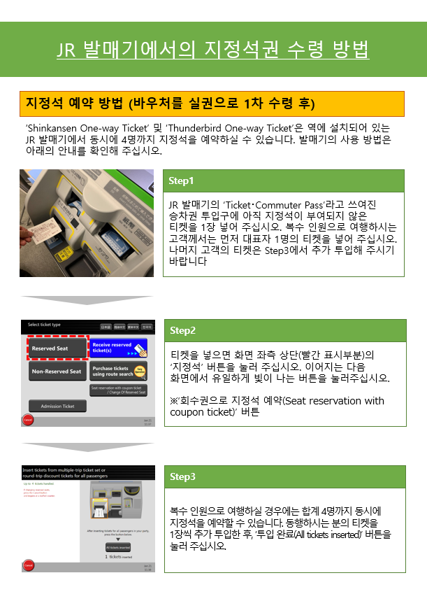 예약시 10장이내로 구매해 주세요. 그 이상 구매시는 경우 바우처가 발행되지 않습니. 1. 이 상품은 자동 예약 상품입니다. 당일 예약 당일 이용 가능합니다. 2. 바우처의 유효기간은 JTR구매일로부터 90일간 유효합니다. (이용지정일이 아닌 구매일) 3. 바우처를 실권으로 교환한 후에는 티켓 교환 시 지정한 날짜에만 유효합니다. 4. 예약 시 성별 구분이 필요합니다. (MR, MS, CH) 중 하나를 꼭 기재해주세요. *CH : 아동 5. “오사카 시내→하카타” 등 이용방향을 맞게 예약해주시길 바랍니다. “오사카 시내→하카타” 티켓으로 “하카타→오사카 시내” 방향으로 이용하실 수 없습니다. 6. 유효기간 내 미사용 티켓은 무료 취소 가능합니다. 7. 바우처를 실권으로의 교환 후에는 여행사에서 환불이 불가능합니다. 단, 미사용 티켓이라면 티켓을 교환한 마도구치에서 수수료 지불 후 현장에서 현금으로 환불 가능합니다. 이용일 2일전까지 자유석의 경우 440엔, 지정석의 경우 560엔의 환불수수료가 부과됩니다. 이용일 1일전~열차시각까지는 승차권220엔+티켓가격의 30%가 환불수수료로 부과됩니다. * 간사이공항(関西空港)역에서도 환불 가능합니다. 8. 일본 이외의 정부의 여권소지자만 이용 가능합니다. 단, 영주권 소지자, 장기체류(유학, 취업비자 등)자는 이용하실 수 없습니다. 9. 티켓 발권 시 여권을 꼭 지참해주세요. 여권 사본으로는 불가능합니다. 10. 바우처를 지정석 티켓으로 교환하기 위해서는 총2회의 교환 과정이 필요합니다. 1) 바우처를 발권기를 통해 1차 발권하시면 “산요신칸센 방일관광티켓(자유석)”을 수령할 수 있습니다. 2) 수령하신 자유석 티켓을 다시 한번 발권기 또는 마도구치에서 교환하시면 지정석 티켓을 받을 수 있습니다. 해당 과정을 통해 발생한 티켓 2종류를 모두 소지하셔야 합니다. 11. 만약 원하시는 시간대의 열차가 만석인 경우, 자유석 티켓으로 이용하거나 다음 열차를 이용해주세요. 자유석 티켓으로 열차 이용 시 자유석과 지정석의 차액은 환불되지 않습니다. 12. 사용 가능한 티켓 발권기는 “5689”과 “passport” 표시가 있고, 여권 판독기가 있는 경우에만 발권 가능합니다. 13. 티켓 발권 진행 시, 파란색의 “JR-WEST ONLINE TRAIN RESERVATION” 버튼이 아닌 보라색의 “재팬 패스로 교환하기(E-티켓)” 버튼을 클릭해주세요