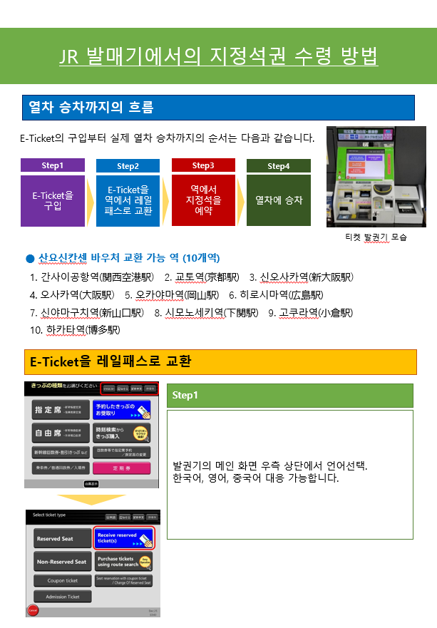 바우처를 지정된 역의 티켓 발권기 또는 미도리노마도구치(みどりの窓口)에서 발급하여 주세요. 발권기는 4개국어(일본어, 한국어, 영어, 중국어) 대응 가능합니다. 발권 시 여권 확인 절차가 있으므로 여권을 꼭 지참해 주세요. 발권된 티켓은 자동 개찰기에 넣어 사용 가능합니다. (역무원에게 티켓 제시가 아닙니다.) 실권으로 교환 후에는 교환 시 이용지정한 날짜에만 이용 가능합니다. * 교환 가능 역 (10개역) 1. 간사이공항역(関西空港駅) 2. 교토역(京都駅) 3. 신오사카역(新大阪駅) 4. 오사카역(大阪駅) 5. 오카야마역(岡山駅) 6. 히로시마역(広島駅) 7. 신야마구치역(新山口駅) 8. 시모노세키역(下関駅) 9. 고쿠라역(小倉駅) 10. 하카타역(博多駅)