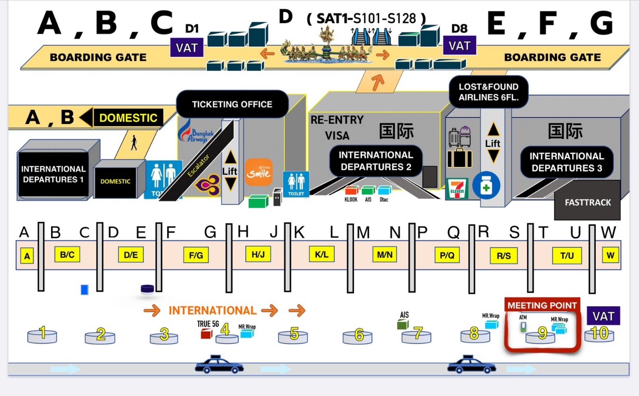 ​- 수완나품 공항 미팅장소(출국장 4층 9번 게이트 안쪽 MR.WRAP 옆)에서 미팅. - 출국 패스트트랙 경우, 보통 항공편명 출발시각 기준 2시간 전에 미팅합니다. 일찍 도착하실 경우, 공항 도착 예정시간을 비상연락처로 연락주세요. (카카오톡 : thaiclubkorea).