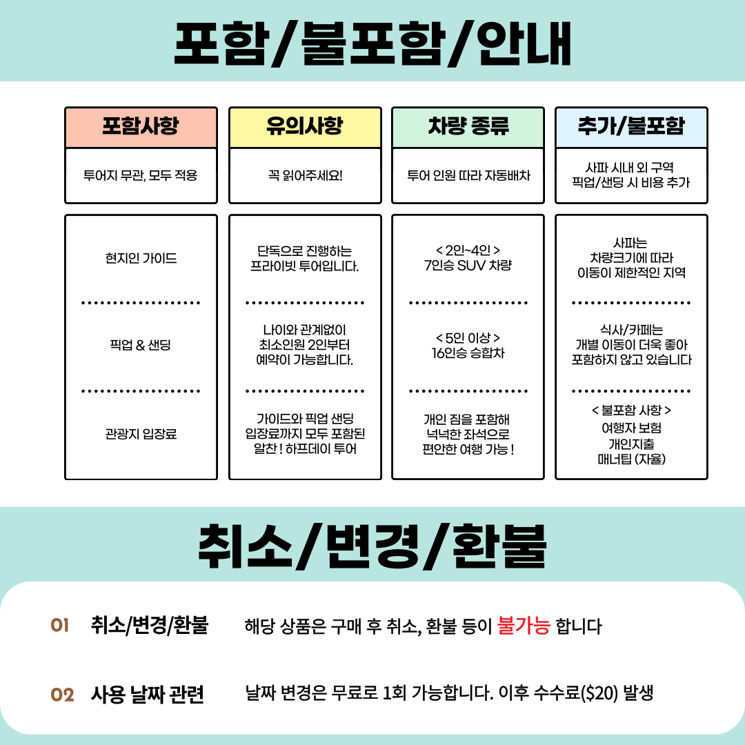 픽업 차량의 고장이나 사고, 도로의 정체 등 예상치 못한 상황으로 인하여, 투어 이후 일정(항공 출발)등에 문제가 발생된 경우에는 보상이나 환불되지 않습니다.