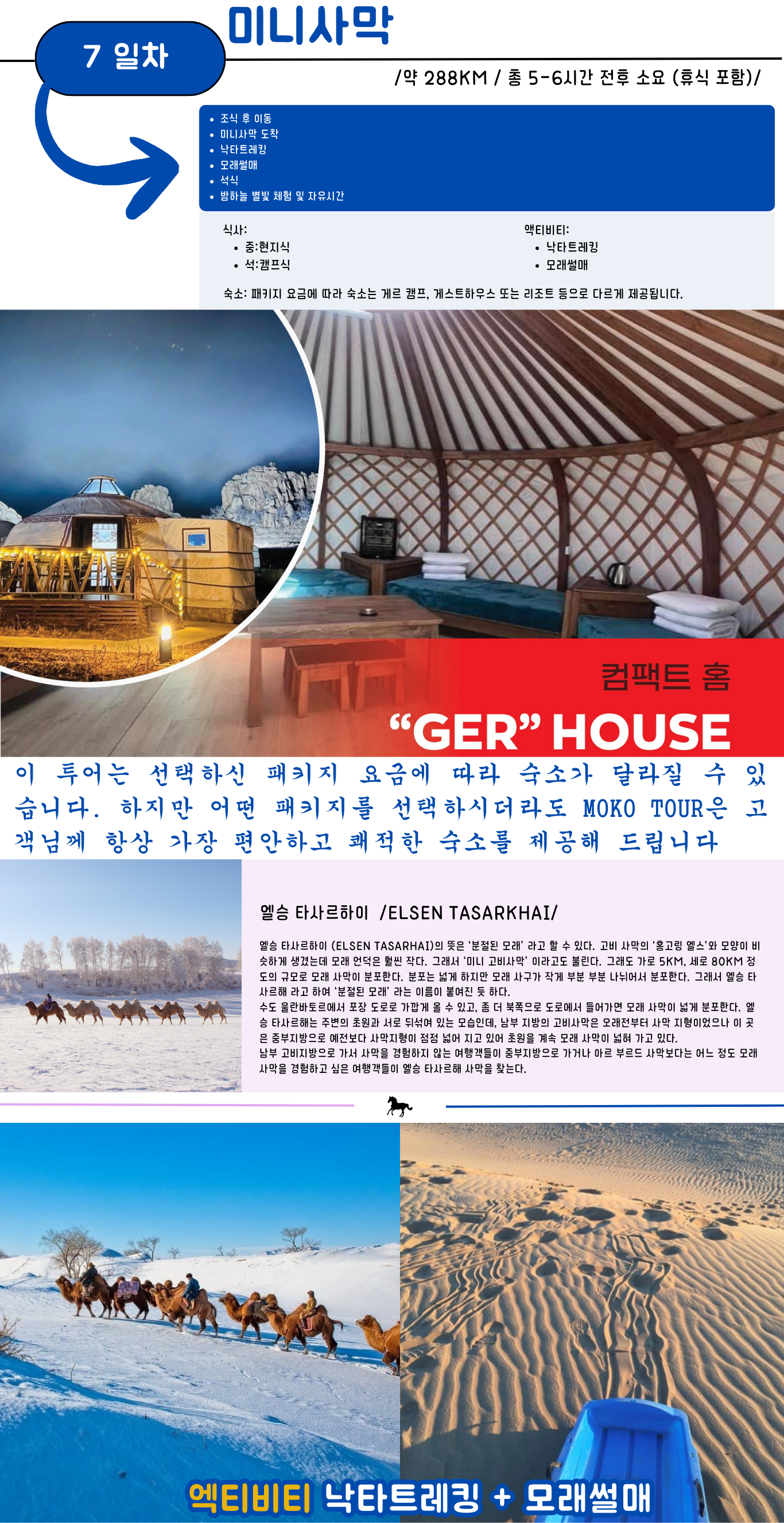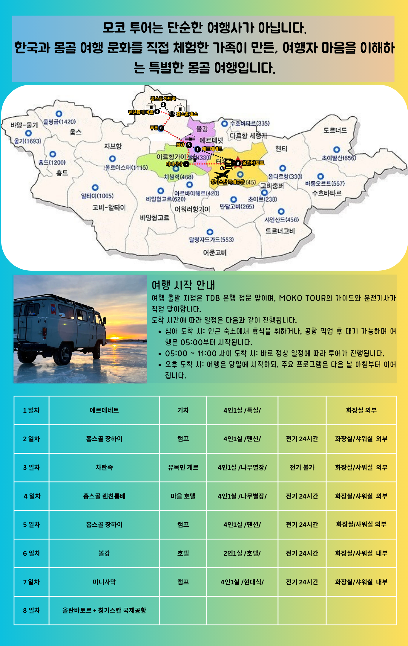 예기치 못한 차량 고장 시 여행사는 대체 차량을 즉시 지원하지만, 몽골 특성상 도착까지 시간이 소요될 수 있습니다. 이로 인한 투어 지연 또는 일정 미소화에 대한 환불은 불가합니다.