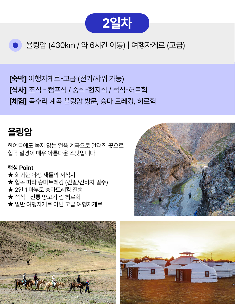 • [2day] 욜링암 독수리 계곡에서 승마트레킹, 전통 양고기찜 허르헉 (여행자 게르 - 고급)