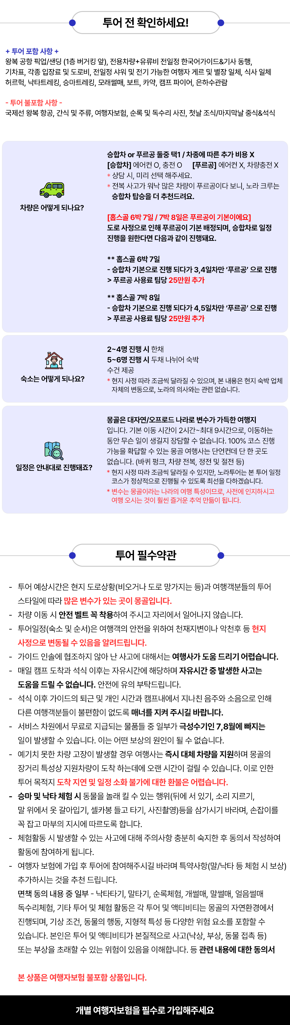 • 여행자 또는 여행사 책임 여부와 무관하게 여행 중 발생 가능한 사고·질병 등은 여행자보험으로 해결합니다. 투어 전 여행자보험 필수 가입을 권장하며, (말/낙타/ATV/말썰매/개썰매/얼음·눈썰매 등) 액티비티 특약 가입을 추천드립니다. 본 상품은 여행자보험 불포함 상품입니다.