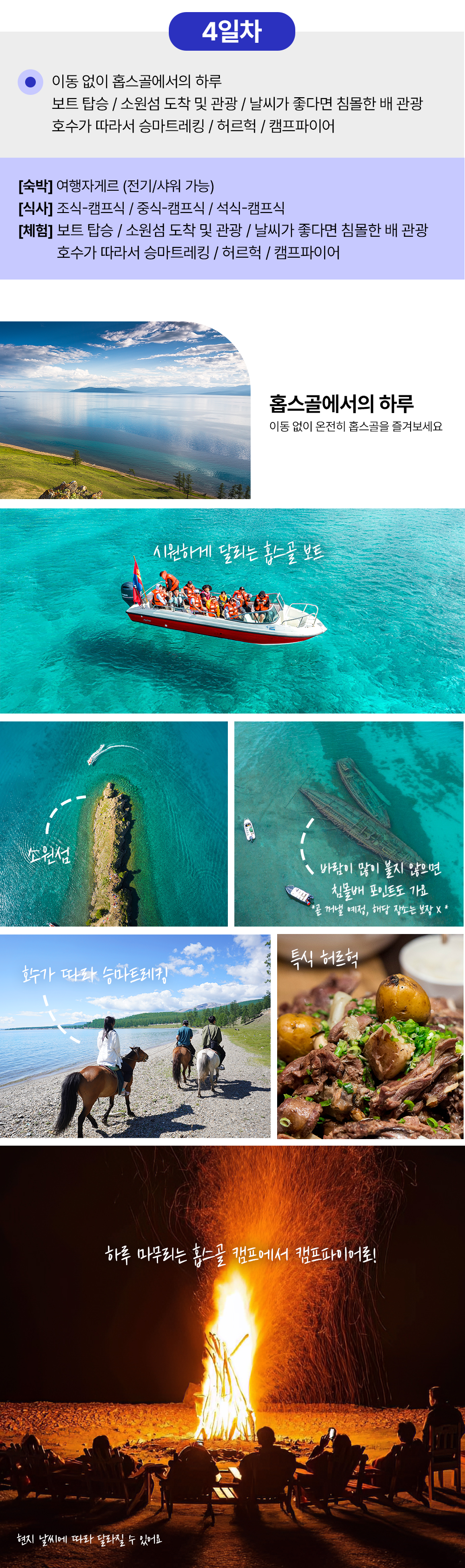 • [4day] 아침부터 보트 타기, 승마로 홉스골 호수의 대자연을 만끽한 뒤 저녁엔 캠프파이어로 하루를 마무리합니다. (여행자 게르 숙박)