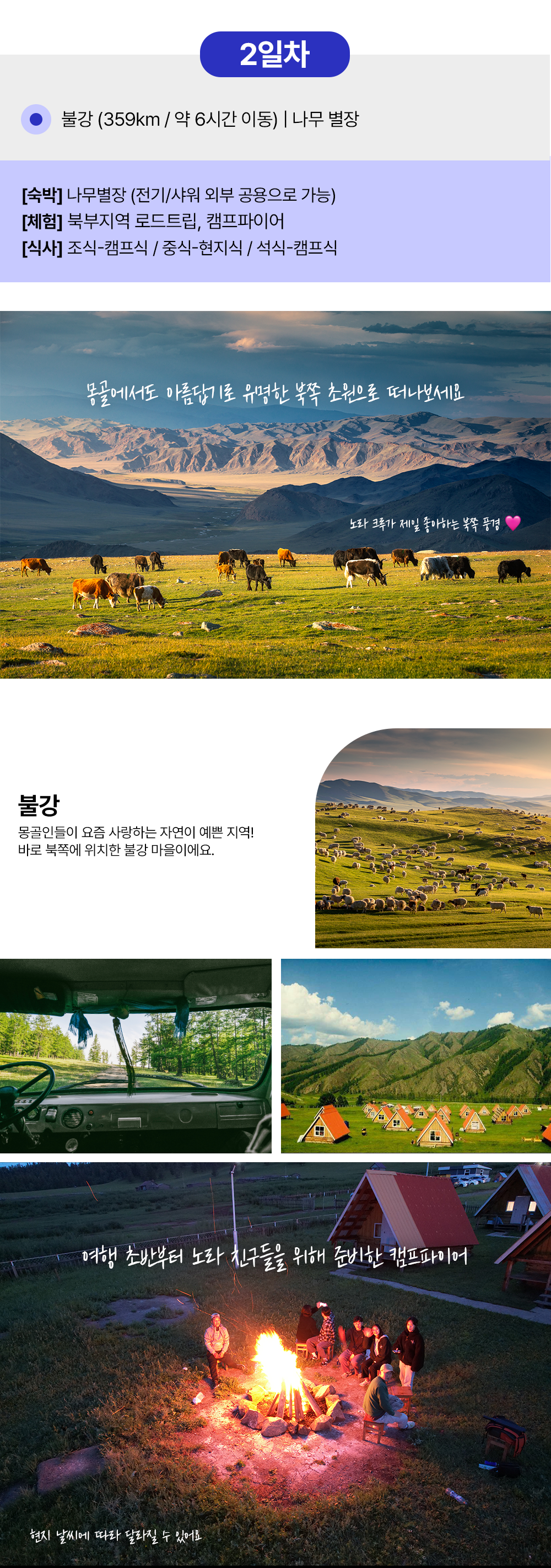 • 석식 이후 가이드의 퇴근 및 개인 시간이 보장되며, 캠프 내 과도한 음주·소음으로 다른 여행객에게 불편을 주지 않도록 매너를 지켜주세요.