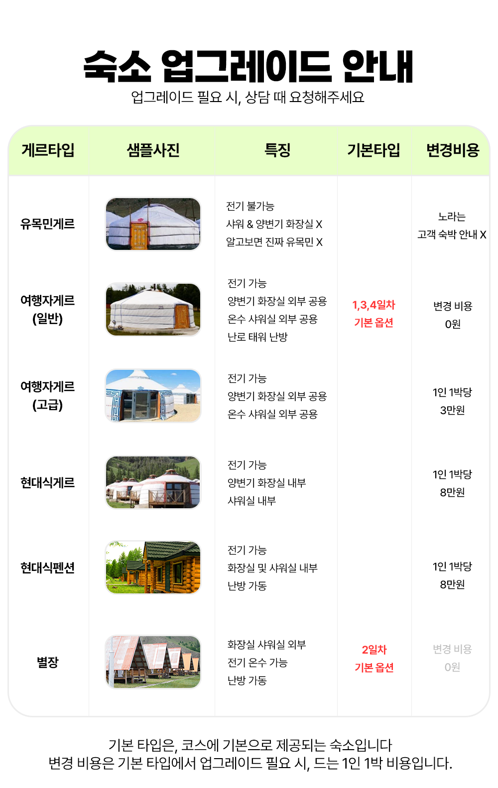 • 예기치 못한 차량 고장 발생 시 여행사는 즉시 대체 차량을 지원하나, 몽골의 장거리 특성상 도착까지 시간이 소요될 수 있습니다. 이로 인한 목적지 도착 지연 및 일정 미소화에 대한 환불은 어렵습니다.